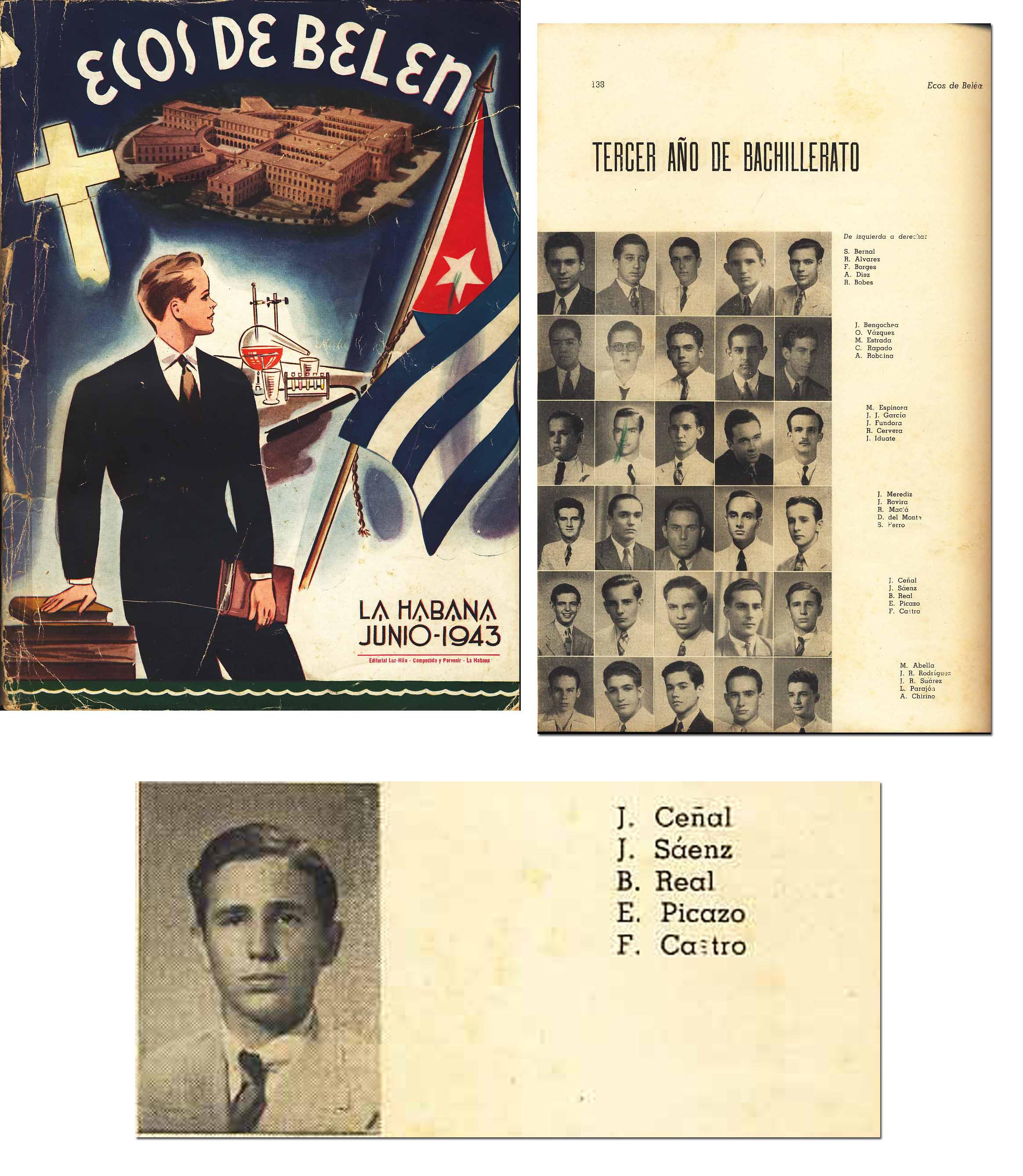 Exceptionally rare 1943 high school yearbook for Fidel Castro. Spanish language yearbook cover reads: “Ecos DE Belen / La Habana / Junio – 1943.” Features a young Castro to page 138 with the text, “Tercer Ano De Bachillerato.” A fascinating Castro lot in very good condition.