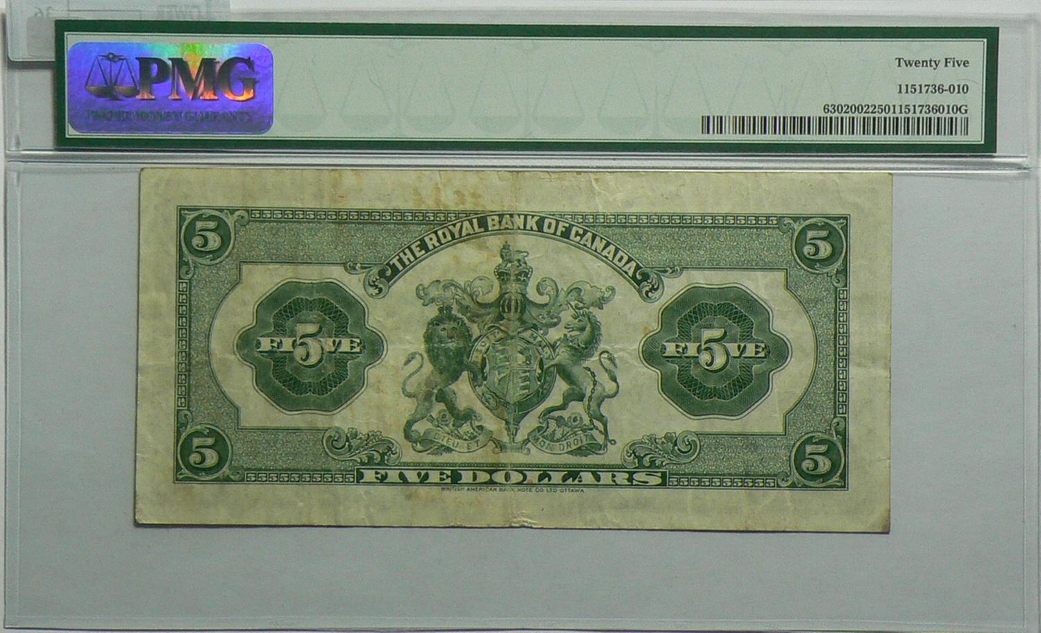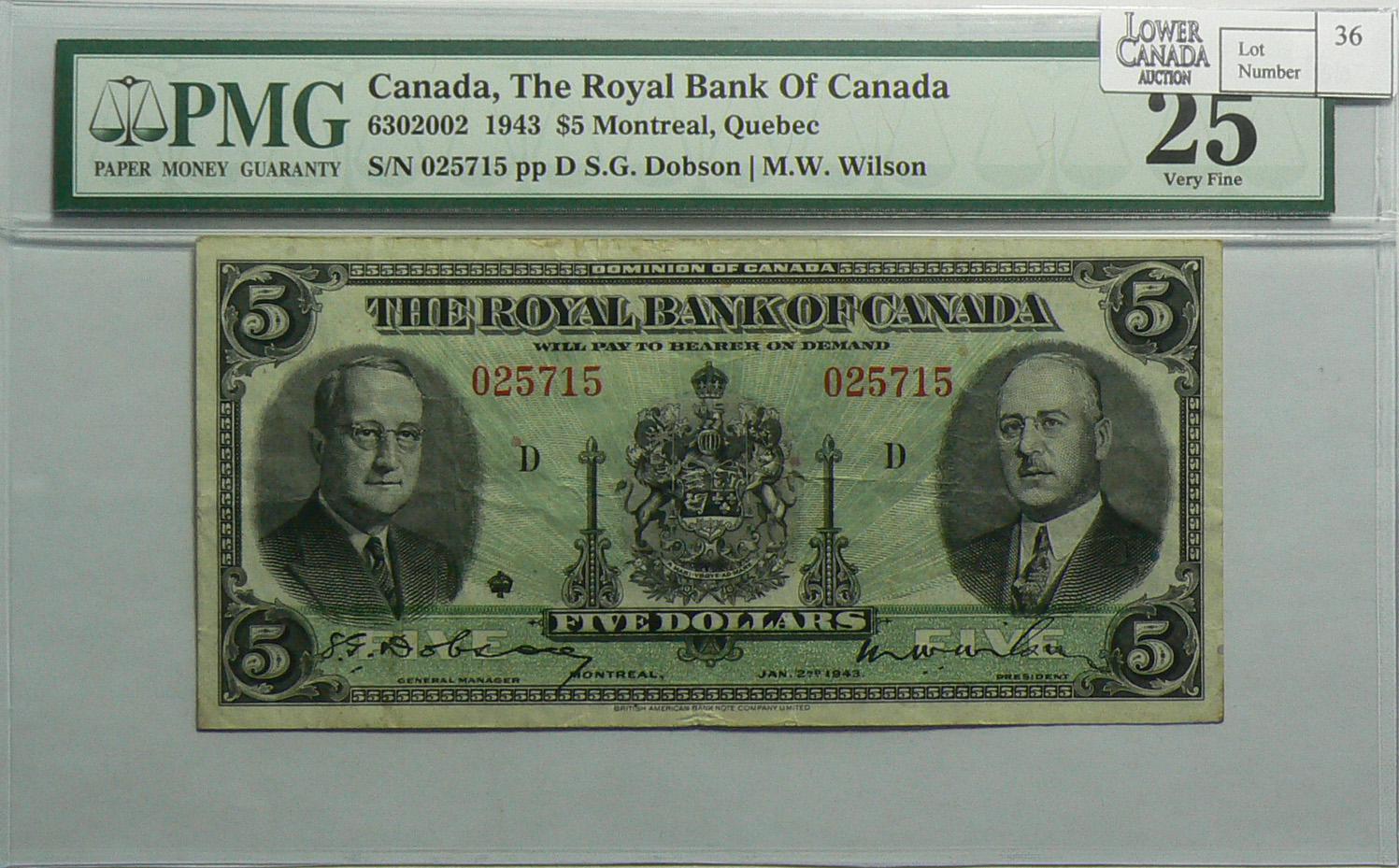 1943 Five Dollars Royal Bank of Canada, 630-20-02, PMG VF-25, Dobson Wilson, Letter D, serial 025715.