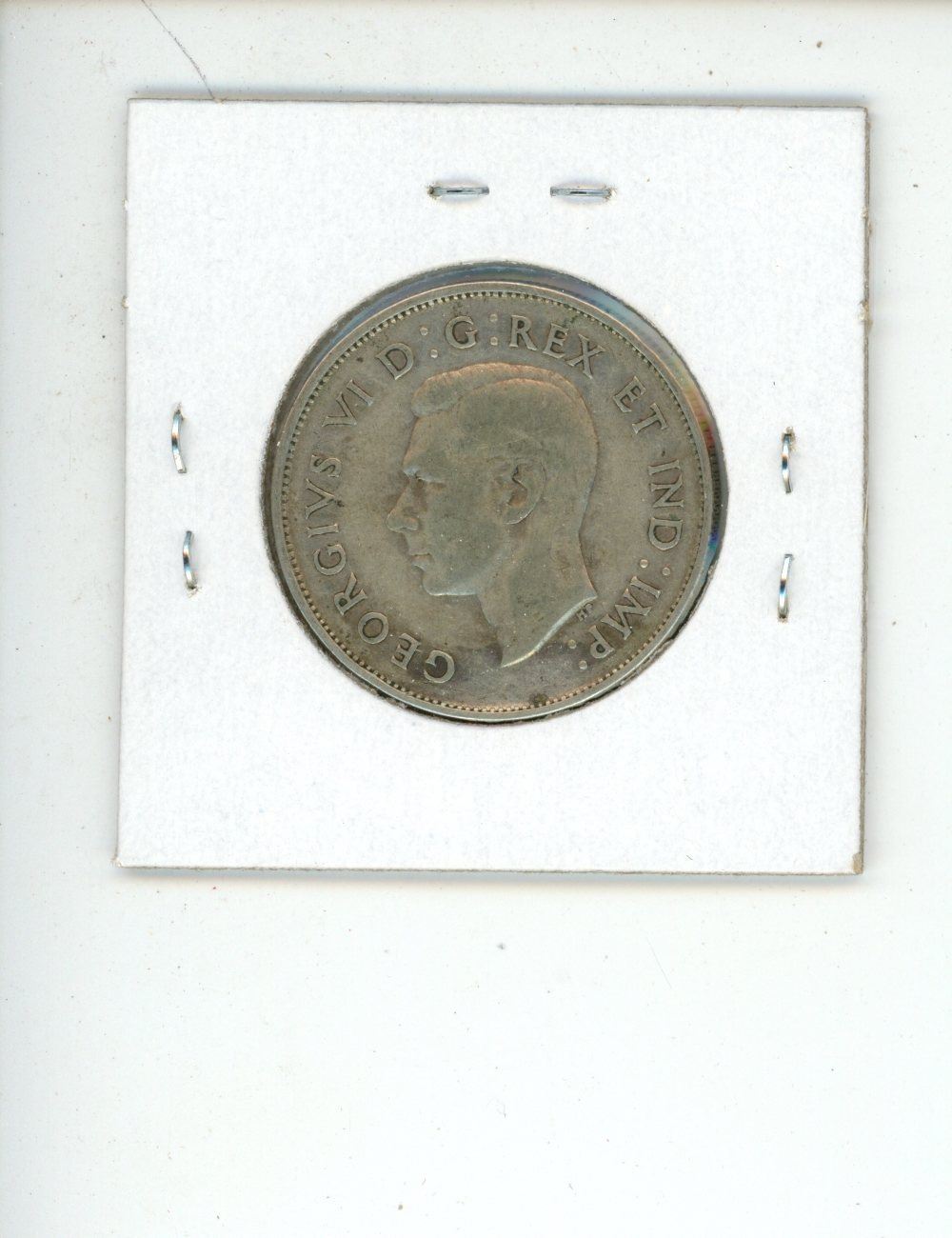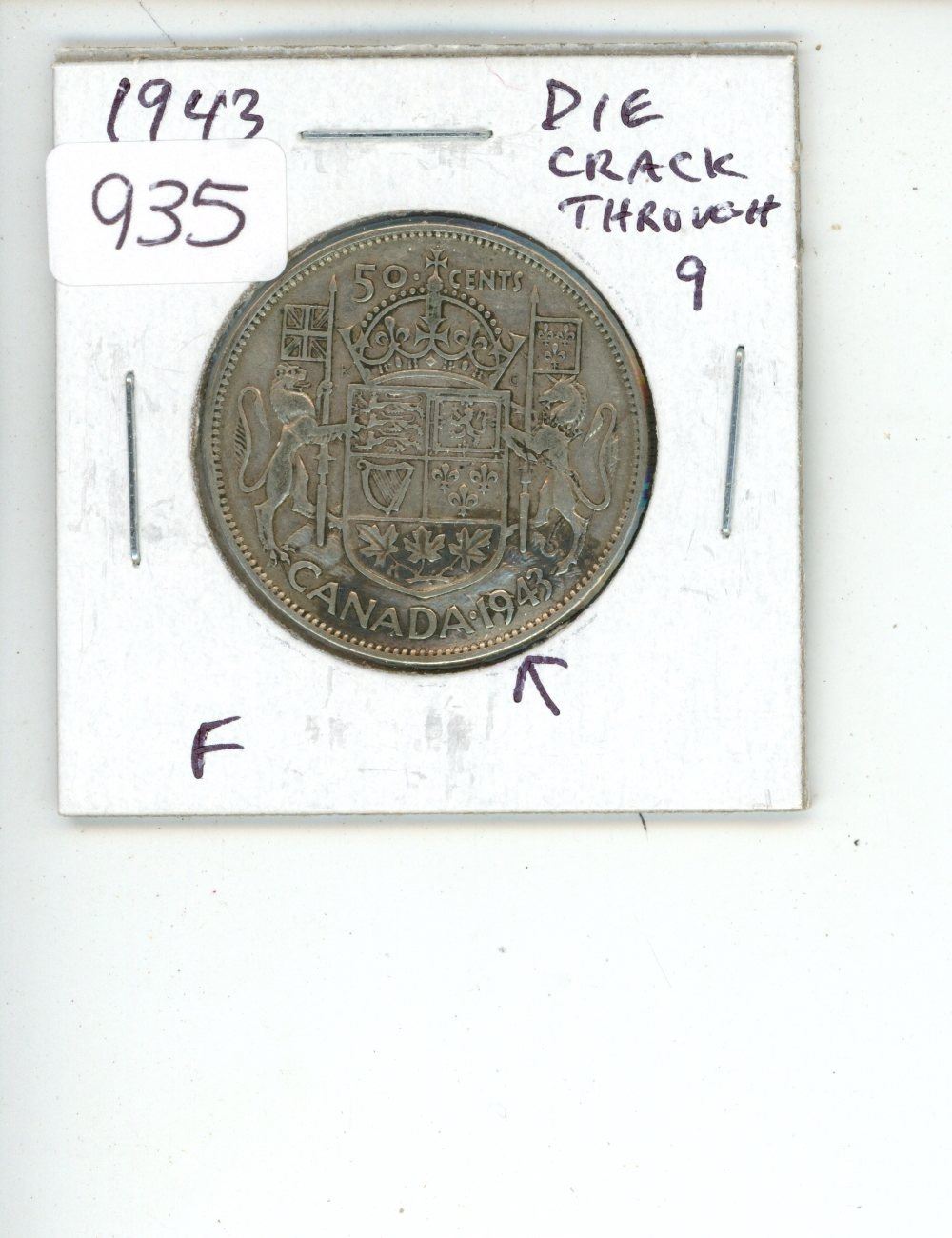 1943 George VI Silver 50 Cents. Die Crack above 9 in Date. World War II issue. F-12.