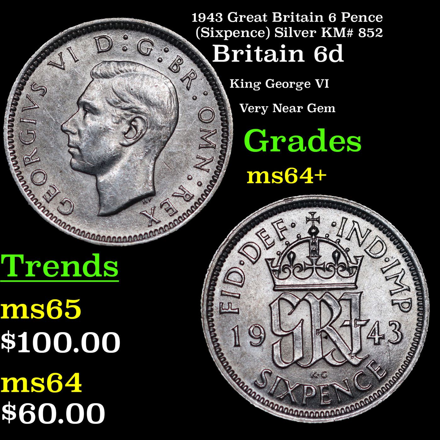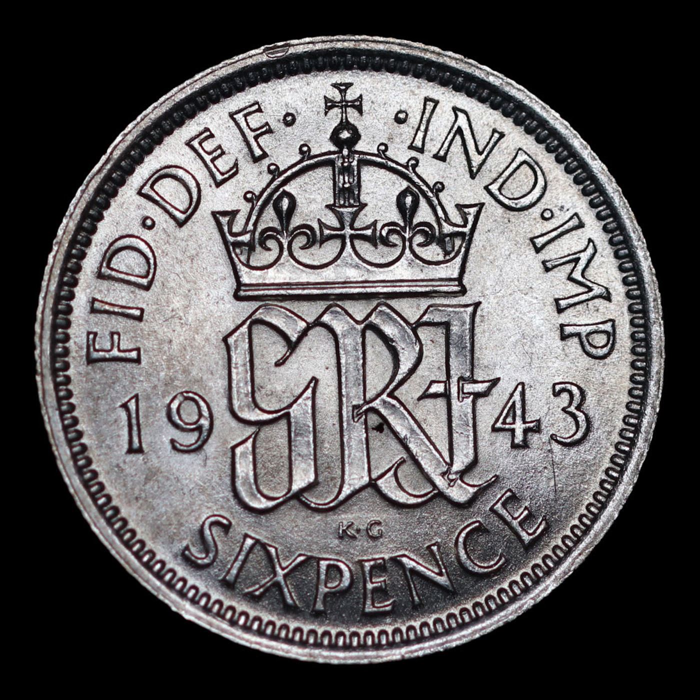 1943 Great Britain 6 Pence (Sixpence) Silver KM# 852 Grades Choice+ Unc.
