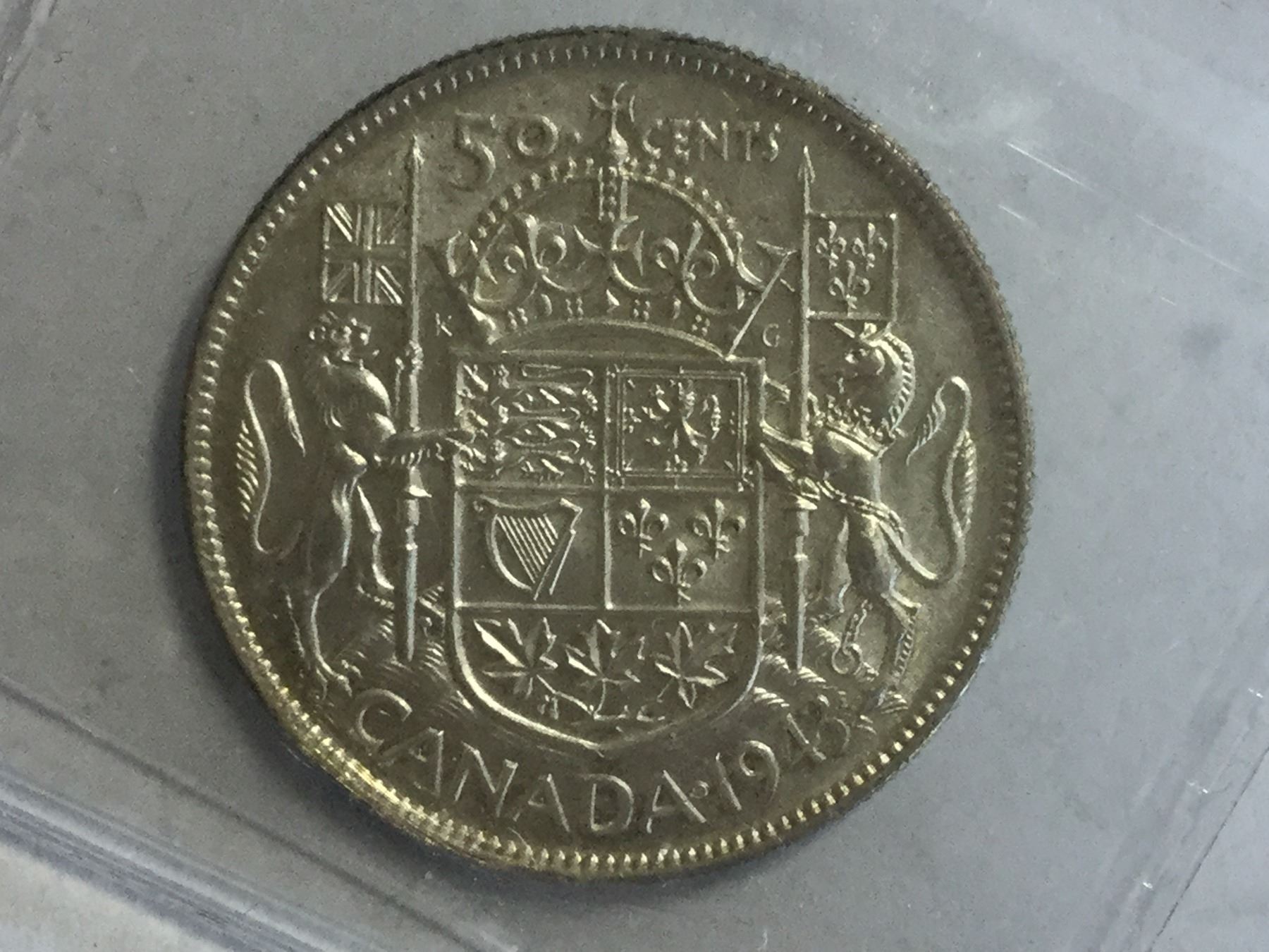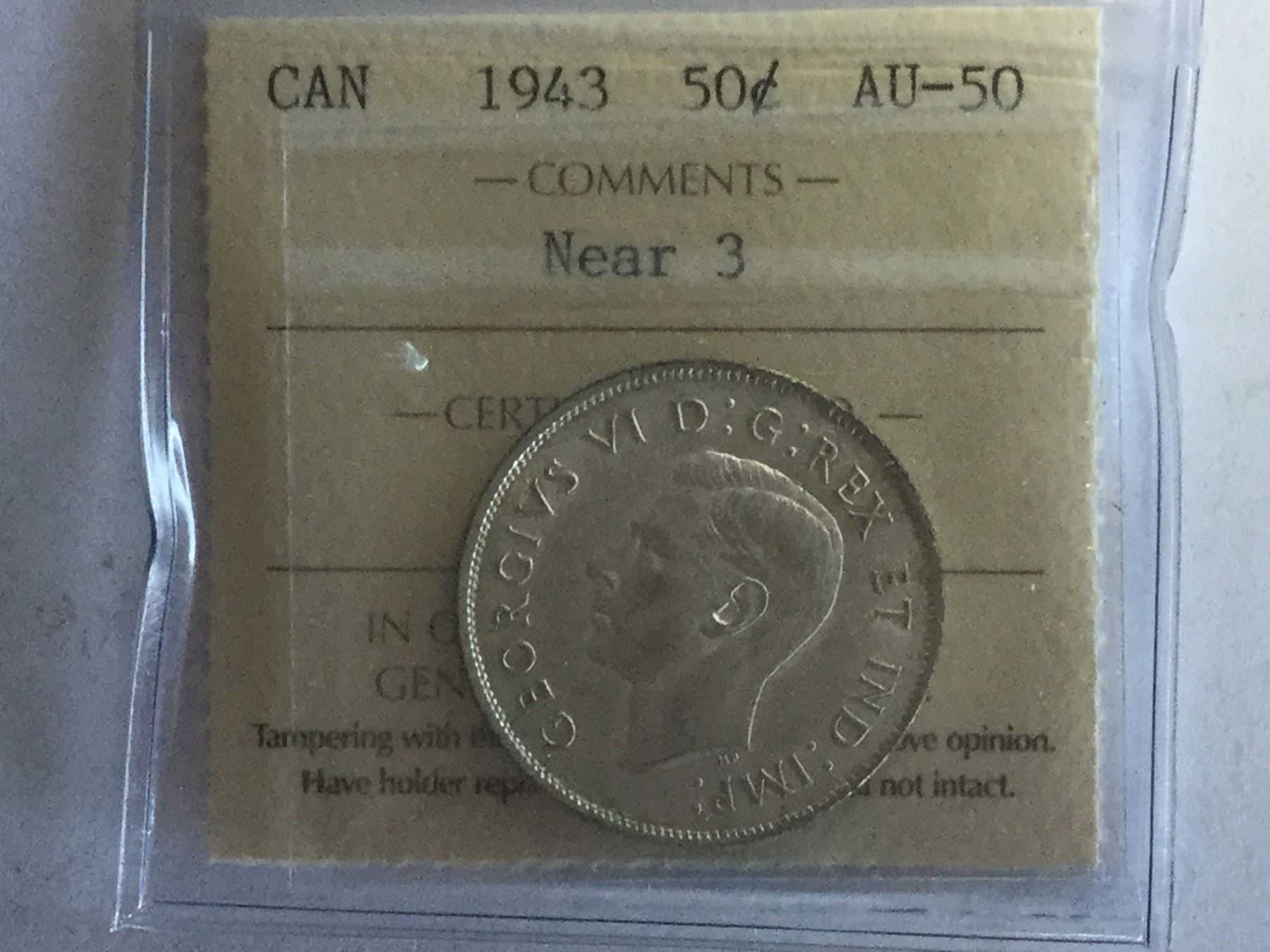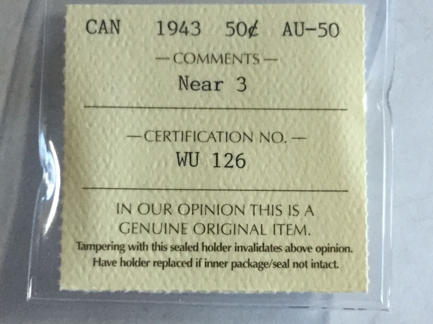 1943 ICCS Certified #WU126, Canada Fifty Cent Coin AU50
