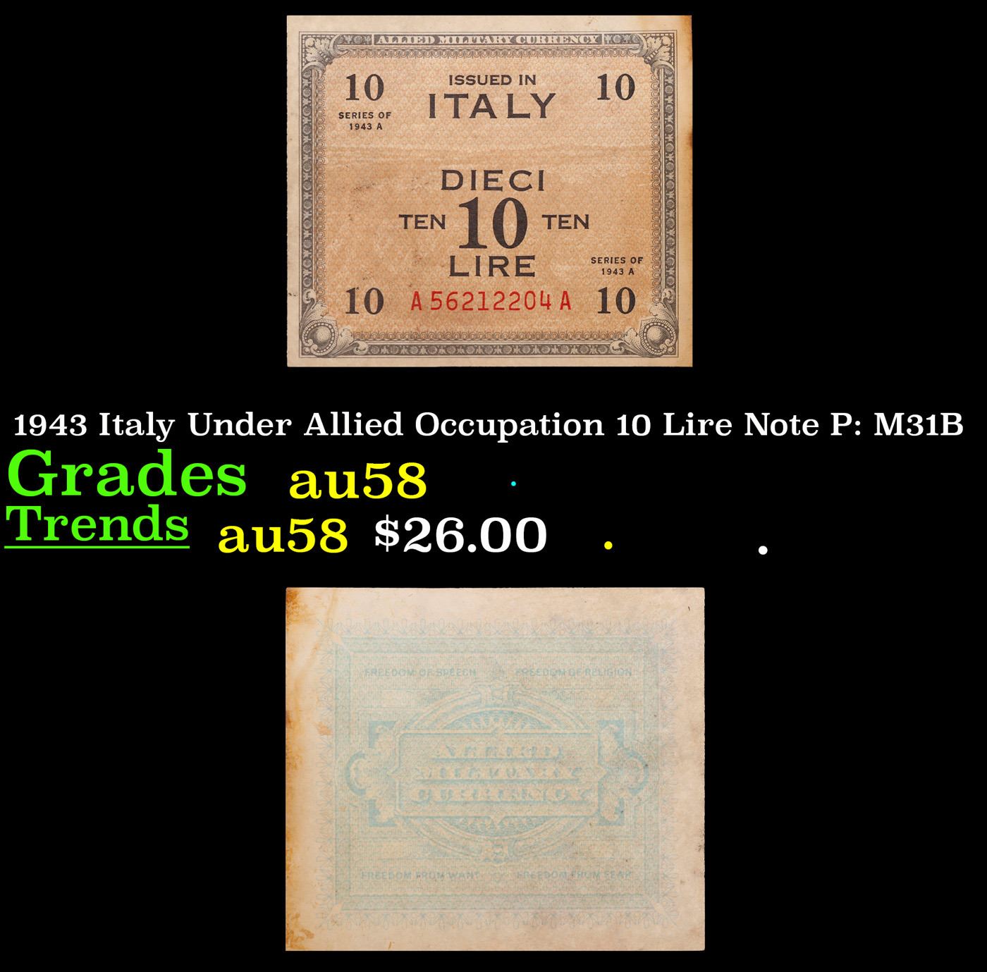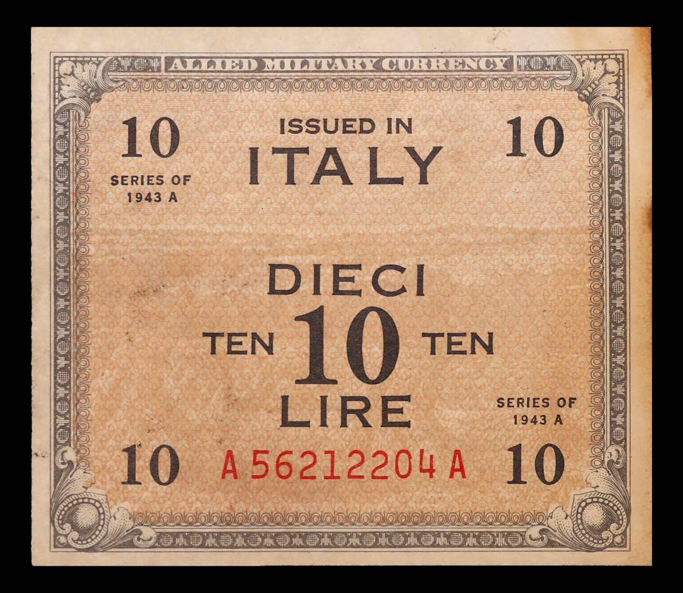 1943 Italy Under Allied Occupation 10 Lire Note P: M31B Grades Choice AU/BU Slider. The AM-lira was the currency issued in Italy by Allied Military Government for Occupied Territories (AMGOT) after the Allied invasion of Sicily in 1943. 100 AM-lire were worth 1 US dollar, and there were two issues: 1943 and 1943A. Totally interchangeable with the normal Italian lira for military decision, it contributed to high inflation that hit Italy towards the end of World War II. Due to rampant inflation, Italy ultimately did not reissue the banknotes for 1 and 2 lire, which had since become useless. After 1946, the AM-lira ceased to be the sole currency and were used along with normal notes, until June 3, 1950.