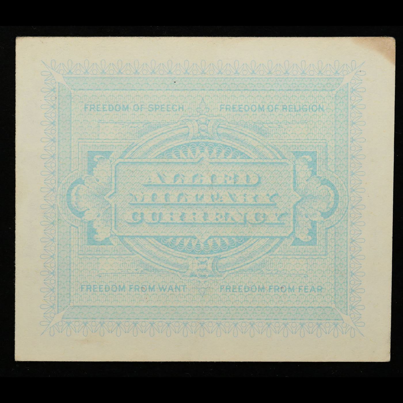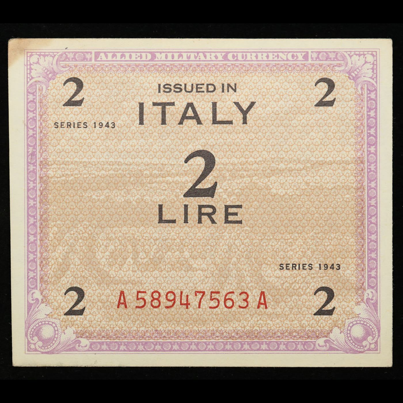1943 Italy WWII Allied Military Currency 2 Lire Note P# M11a, with F Grades. The AM-lira was the currency issued in Italy by Allied Military Government for Occupied Territories (AMGOT) after the Allied invasion of Sicily in 1943. 100 AM-lire were worth 1 US dollar, and there were two issues: 1943 and 1943A. Totally interchangeable with the normal Italian lira for military decision, it contributed to high inflation that hit Italy towards the end of World War II. Due to rampant inflation, Italy ultimately did not reissue the banknotes for 1 and 2 lire, which had since become useless. After 1946, the AM-lira ceased to be the sole currency and were used along with normal notes, until June 3, 1950.