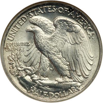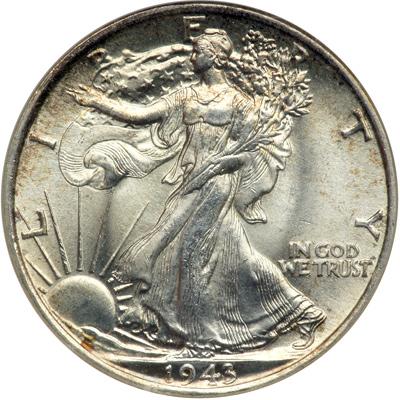 1943 Liberty Walking Half Dollar. NGC graded MS-65. A well struck white example with a touch of gold about the borders.