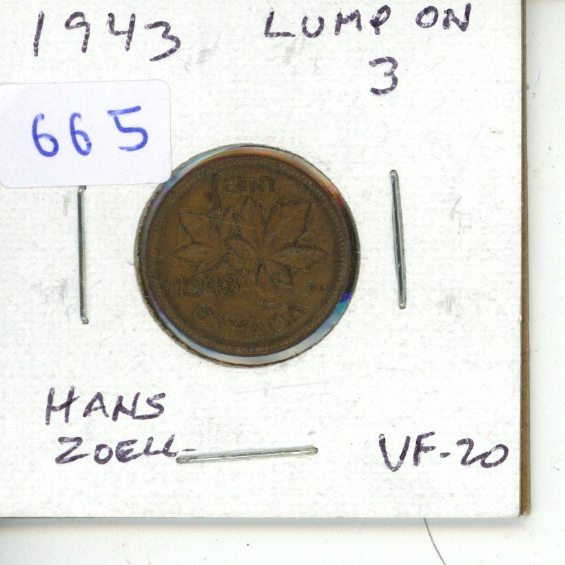 1943 Lump on 3 in Date Canadian Small Cent. Hans Zoell variety. VF-20.