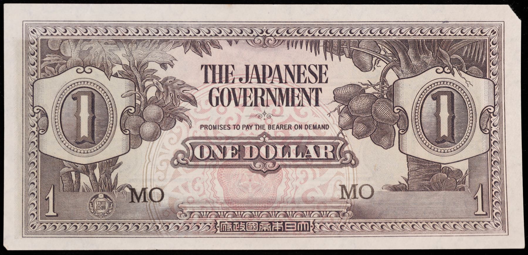 1943 Malaya Under Japanese Occupation 1 Pesos Note (JIM) P# M5C Grades Select CU. Japanese invasion money, officially known as Southern Development Bank Notes (Japanese: ??????? Dai T?-A Sens? gunpy?, "Greater East Asia War military scrip"), was currency issued by the Japanese Military Authority as a replacement for local currency after the conquest of colonies and other states in World War II. Japan printed this currency for many countries, including Malaysia, Singapore, North Borneo, Sarawak, Burma, Brunei, and several Oceania territories controlled by Australia.