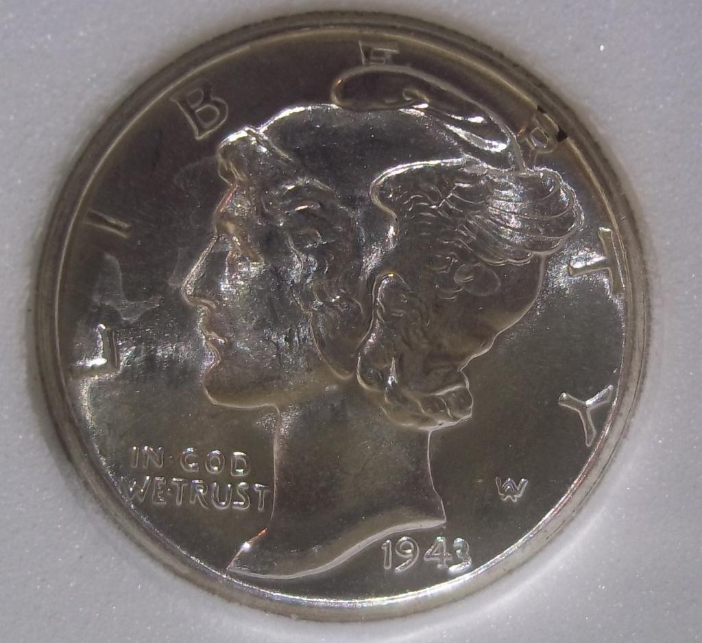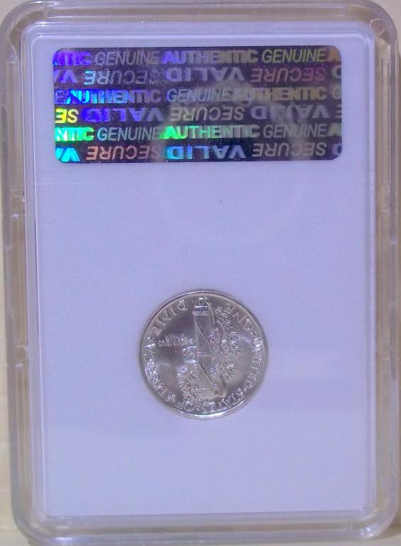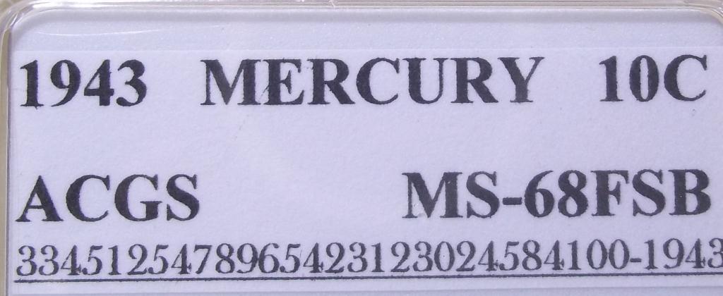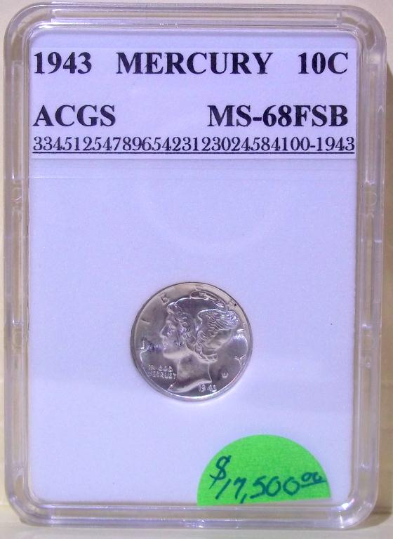 1943 Philadelphia Mint Mercury Dime, certified and graded Mint State 68 Full Split Bands by ACGS! Only the first strike coins have the coveted Full Split Bands reverse, and they sell for many times the price of more common strikes. The Dimes featured today are all from the estate of a fanatic collector who ONLY accepted the very highest grade coins available. The widow has NO INTEREST WHAT SO EVER in coin collecting, and she wants them GONE!