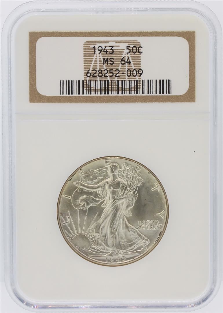 One 1943 NGC Graded MS64 Walking Liberty Half Dollar Silver Coin. NGC Certified.