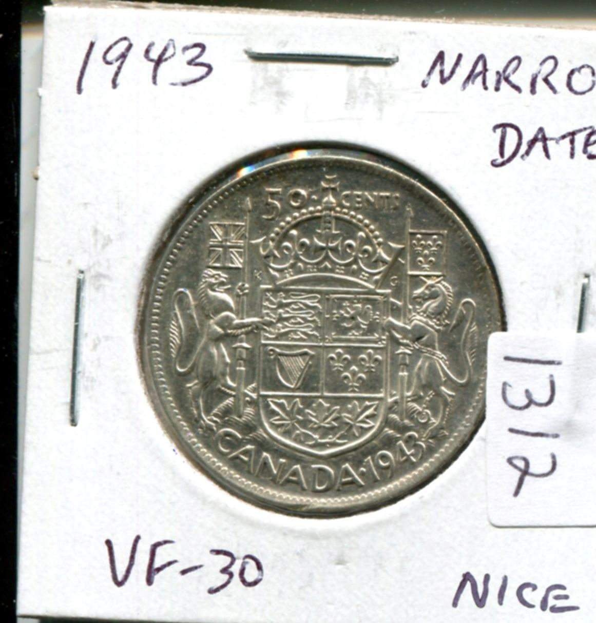 1943 Narrow Date Silver 50 Cents. World War II issue. VF-30. Nice.