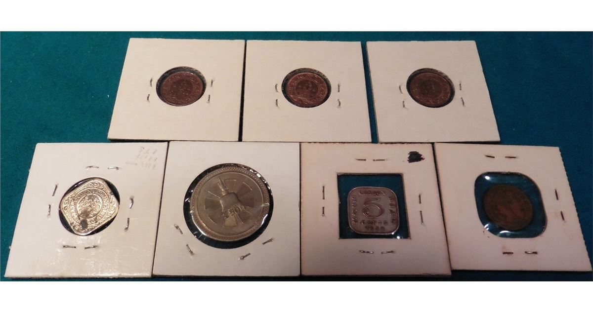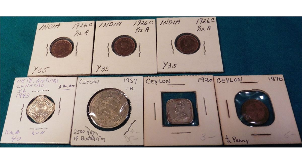 1943 Netherlands Antilles Curacao Five Cent, BU, but spotted, Catalog value $22; (3) 1926 C British India 1/12 Anna (1 Pie) KM # 509. Red-Brown Uncirculated. KM value $30.00; & Ceylon 1870 Half Penny VF, 1920 Five Cent VF, & 1957 One Rupee “2500 Years of Buddhism” Commemorative.