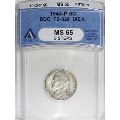 <B>1943-P 5C Doubled Die Obverse MS65 Full Steps ANACS.</B></I> FS-029. Die 6. The famous "doubled eye" variety. NGC Census: (0/0). PCGS Population (9/15). (#84174)<BR><BR><b>Shipping:</b> Coins & Currency (<a target="_blank" href="http://www.heritageauctions.com/common/shipping.php">view shipping information</a>)