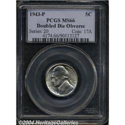 <B>1943-P<5C> Doubled Die MS66 PCGS.</B></I> Jefferson's eye is widely die doubled, and LIBERTY and the date are noticeably doubled. A lustrous Gem with faint gold color and a crisp strike. Population: 24 in 66, 0 finer (3/04). <BR><BR><B>Important notice:</B> Heritage usually auctions material at the rate of 200-250 lots per hour. On some occasions eBay Live bid software or the Internet may not be able to keep up with the pace of the auction. We recommend placing a realistic absentee bid now as insurance to avoid disappointment. Occasionally the auctioneer may eliminate or reject an eBay Live bid, and the auctioneer may also reopen a lot after the close of the eBay live bidding (usually because we missed an audience bid), and may reject your bid even if it shows you as the winning bidder. By bidding via eBay Live, you agree that Heritage may award the lot to another bidder at its sole discretion under the circumstances described above or any other reasonable circumstances. Since eBay bids are not shown to us until we open the lot on the floor, we treat those bids just like floor bids. In most cases the floor responds before the eBay bid is presented to us, due to Internet lag time, so for consistency we have made it a policy that floor bids are always considered first over tie eBay live bids. Also please note that all Heritage lots purchased through eBay Live carry a 20% Buyer's Premium. Please make sure you read the Terms and Conditions before you bid.