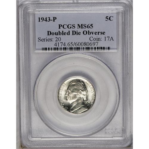 <B>1943-P<5C> Doubled Die Obverse MS65 PCGS.</B></I> FS-029. The date and LIBERTY exhibit the most prominent die doubling. A crisply struck and lustrous Gem. The fields are well preserved, and the only detectable contact is near the nose. Population: 30 in 65, 37 finer (6/06).
