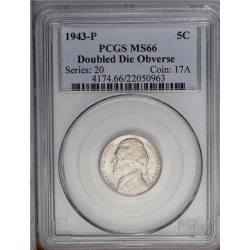 <B>1943-P 5C Doubled Die Obverse MS66 PCGS.</B></I> FS-029. Jefferson's eye, LIBERTY, and the date show the widest spread, although all obverse design elements are die doubled. Delicate powder-blue and chestnut colors ensure the originality of this lustrous and gorgeously preserved premium Gem.