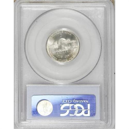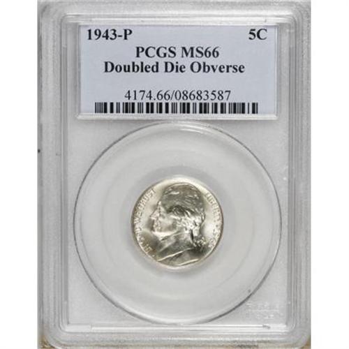 <B>1943-P 5C Doubled Die Obverse MS66 PCGS.</B></I> FS-029. The "doubled eye" doubled die, most notable for the namesake doubling evident at Jefferson's eye. Both sides offer strongly lustrous and carefully preserved surfaces. The steps on the reverse show only slight incompleteness. Tied for the finest example certified by PCGS (1/08).<BR><BR><B>Coin Engraver:</B> Felix Schlag<BR><BR><b>Shipping:</b> Coins & Currency (<a target="_blank" href="http://www.heritageauctions.com/common/shipping.php">view shipping information</a>)