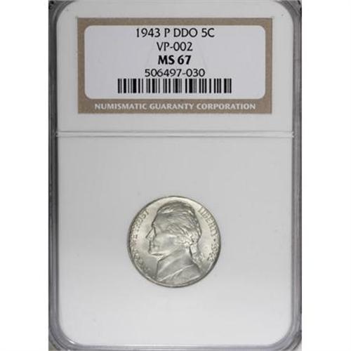 <B>1943-P 5C Doubled Die Obverse MS67 NGC.</B></I> FS-029. The "Doubled Eye" variety, which receives a photograph in the 2008 <I>Guide Book</B></I>. The date and LIBERTY are also nicely die doubled. Lustrous, lightly toned, and splendidly smooth.<BR><BR><B>Coin Engraver:</B> Felix Schlag<BR><BR><b>Shipping:</b> Coins & Currency (<a target="_blank" href="http://www.heritageauctions.com/common/shipping.php">view shipping information</a>)