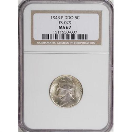 <B>1943-P 5C Doubled Die Obverse MS67 NGC.</B></I> FS-029. The strike is solid and the luster strong on this lightly gold-toned Superb Gem, a wonderful example of the popular Doubled Eye doubled die. The variety is listed on page 130 of the 2008 <I>Guide Book.</B></I><BR><BR><B>Coin Engraver:</B> Felix Schlag<BR><BR><b>Shipping:</b> Coins & Currency (<a target="_blank" href="http://www.heritageauctions.com/common/shipping.php">view shipping information</a>)