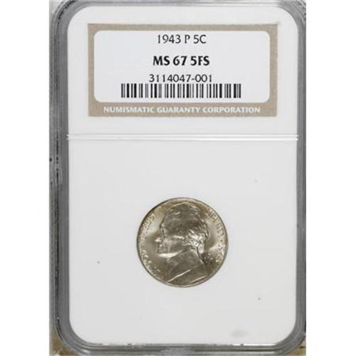 <B>1943-P 5C MS67 Full Steps NGC.</B></I> NGC Census: (19/0). PCGS Population (37/1). (#84018)<BR><BR><b>Shipping:</b> Coins & Currency (<a target="_blank" href="http://www.heritageauctions.com/common/shipping.php">view shipping information</a>)