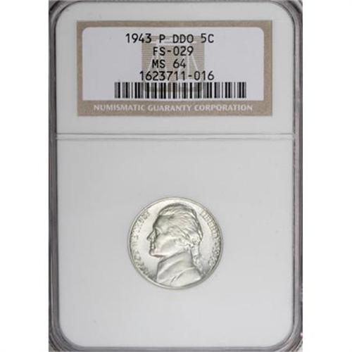 <B>1943-P 5C Doubled Die Obverse MS64 NGC.</B></I> FS-029. NGC Census: (37/3450). PCGS Population (66/2123). Mintage: 271,164,992. Numismedia Wsl. Price for NGC/PCGS coin in MS64: $9. (#4018)<BR><BR><B>Coin Engraver:</B> Felix Schlag<BR><BR><b>Shipping:</b> Coins & Currency (<a target="_blank" href="http://www.heritageauctions.com/common/shipping.php">view shipping information</a>)