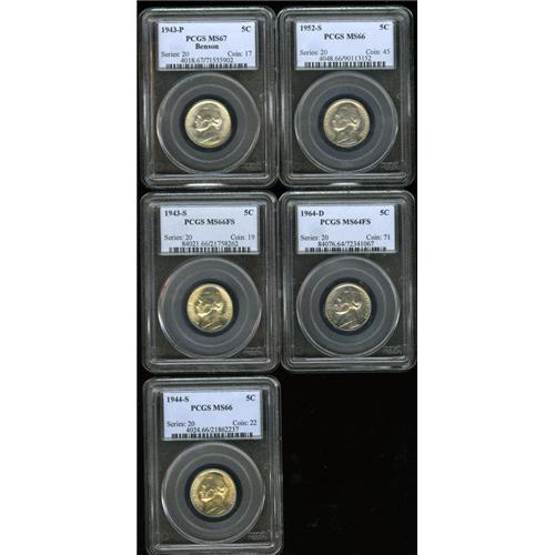 <B>1943-P 5C MS67 PCGS.</B></I> Ex: Benson <B>1943-S MS66FS PCGS; 1944-S MS66 PCGS; 1952-S MS66 PCGS</B></I> and a <B>1964-D MS64FS PCGS.</B></I><BR><BR><b>Shipping:</b> Coins & Currency (<a target="_blank" href="http://www.heritageauctions.com/common/shipping.php">view shipping information</a>)