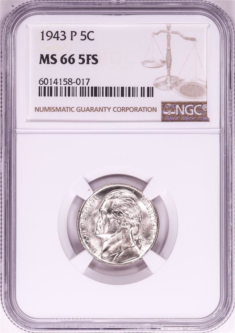 One 1943-P Jefferson Nickel Coin NGC MS66 5FS. NGC Certified.