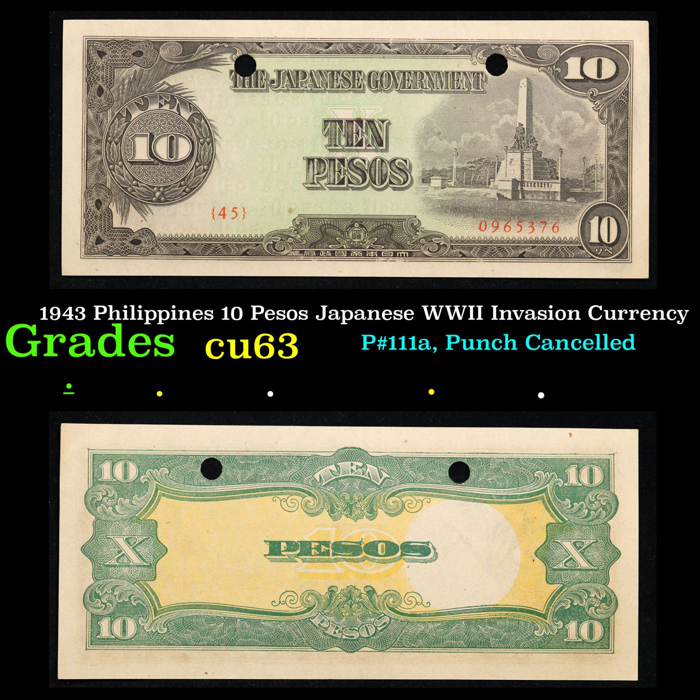 1943 Philippines 10 Pesos Japanese WWII Invasion Currency Grades Select CU. Japanese invasion money, officially known as Southern Development Bank Notes (Japanese: ??????? Dai T?-A Sens? gunpy?, "Greater East Asia War military scrip"), was currency issued by the Japanese Military Authority as a replacement for local currency after the conquest of colonies and other states in World War II. Japan printed this currency for many countries, including Malaysia, Singapore, North Borneo, Sarawak, Burma, Brunei, and several Oceania territories controlled by Australia.