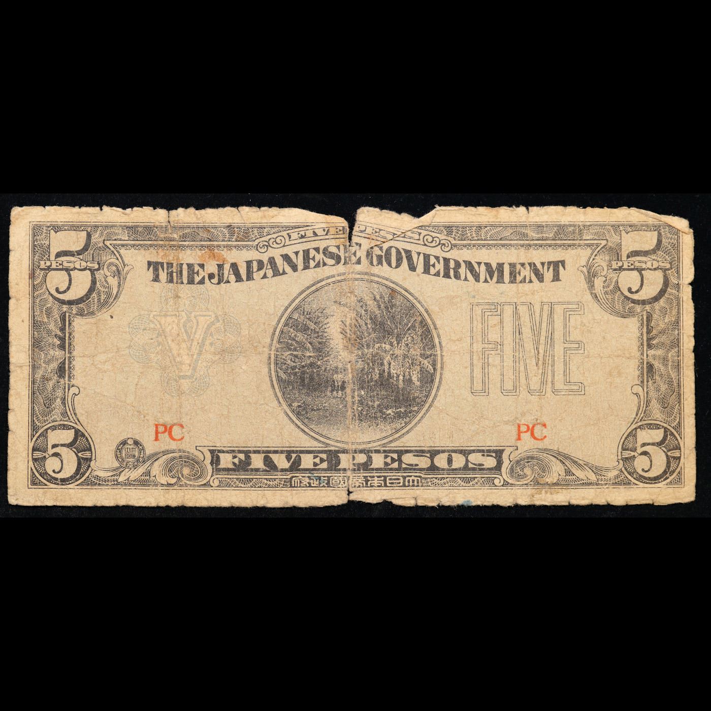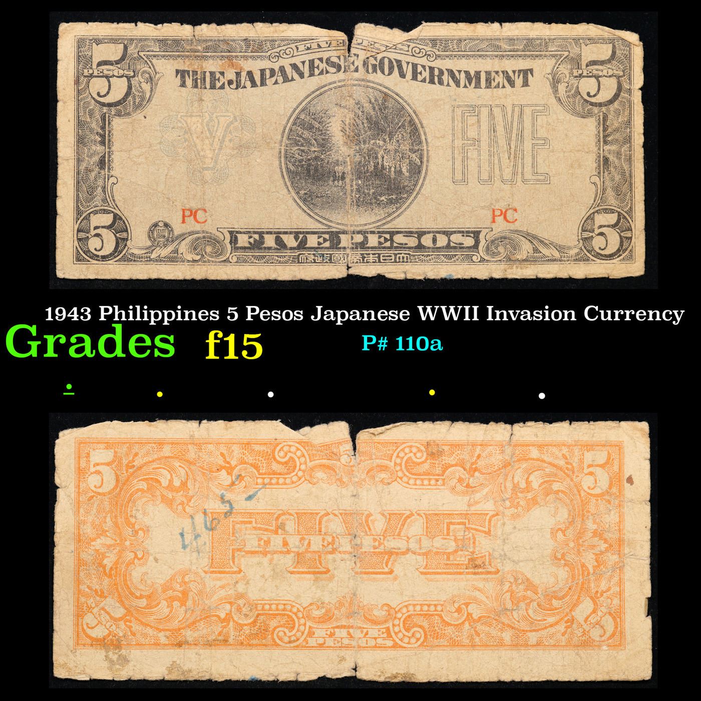 1943 Philippines 5 Pesos Japanese WWII Invasion Currency Grades f+. Japanese invasion money, officially known as Southern Development Bank Notes (Japanese: ??????? Dai T?-A Sens? gunpy?, "Greater East Asia War military scrip"), was currency issued by the Japanese Military Authority as a replacement for local currency after the conquest of colonies and other states in World War II. Japan printed this currency for many countries, including Malaysia, Singapore, North Borneo, Sarawak, Burma, Brunei, and several Oceania territories controlled by Australia.