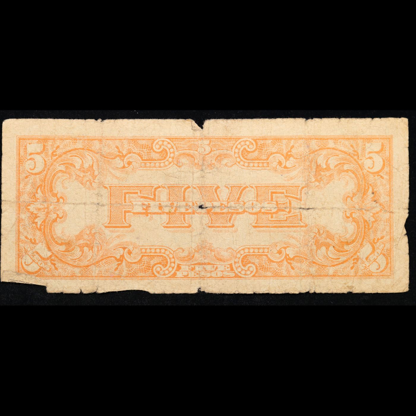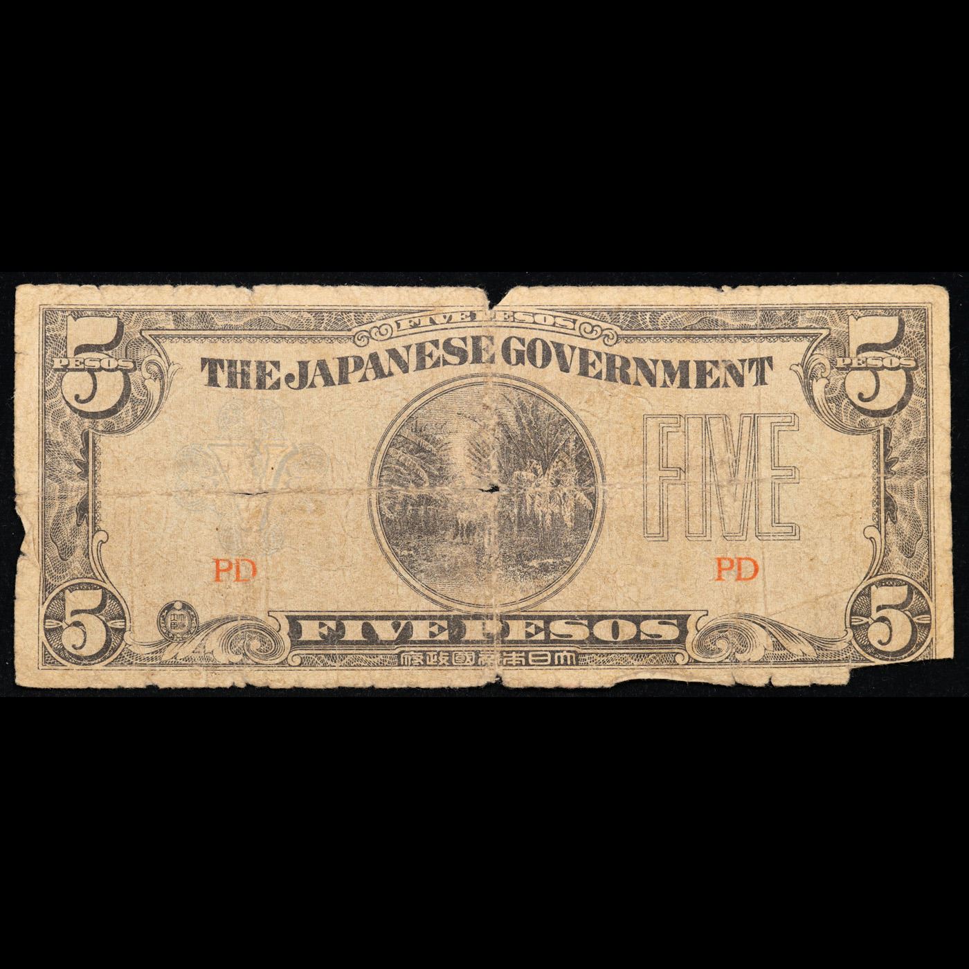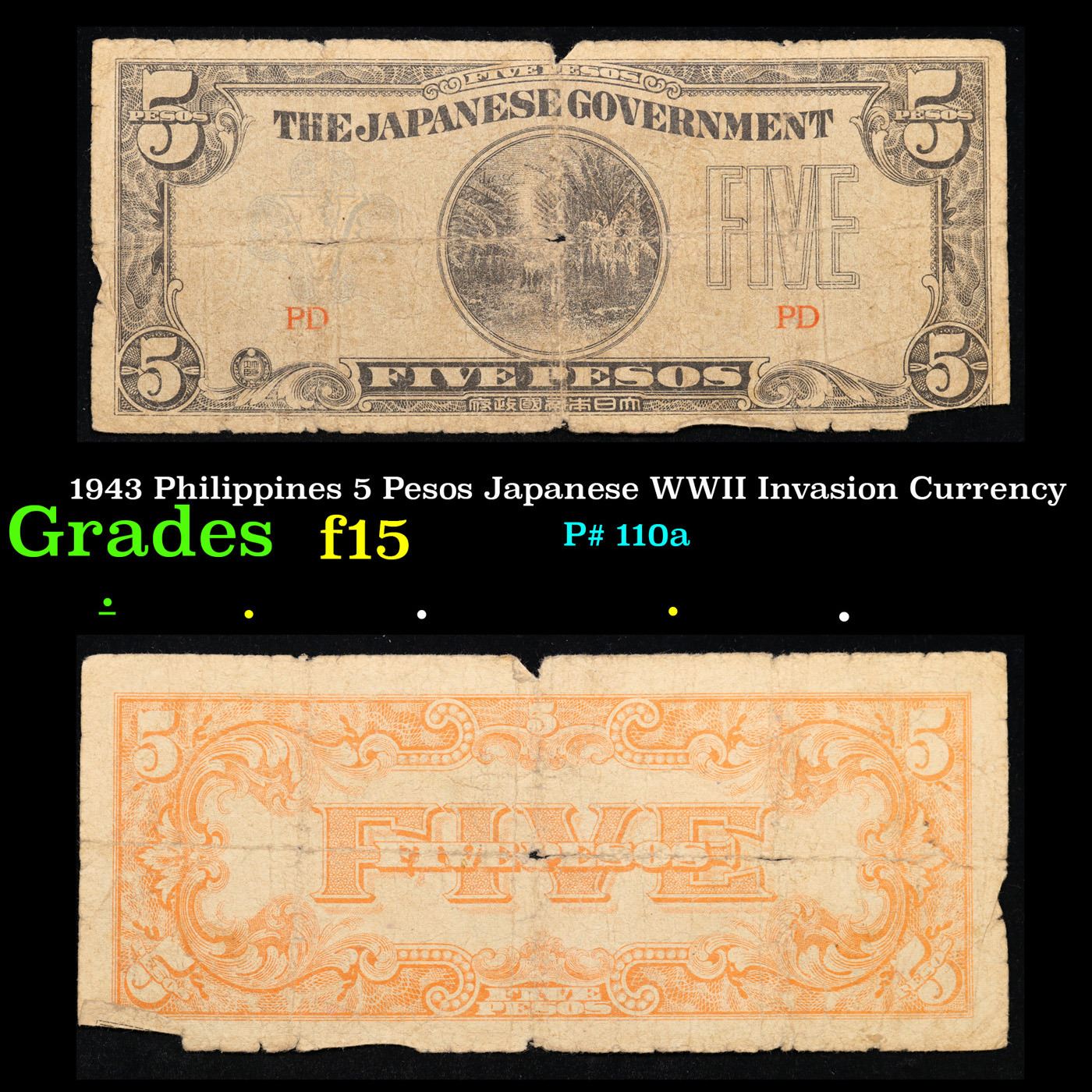 1943 Philippines 5 Pesos Japanese WWII Invasion Currency Grades f+. Japanese invasion money, officially known as Southern Development Bank Notes (Japanese: ??????? Dai T?-A Sens? gunpy?, "Greater East Asia War military scrip"), was currency issued by the Japanese Military Authority as a replacement for local currency after the conquest of colonies and other states in World War II. Japan printed this currency for many countries, including Malaysia, Singapore, North Borneo, Sarawak, Burma, Brunei, and several Oceania territories controlled by Australia.