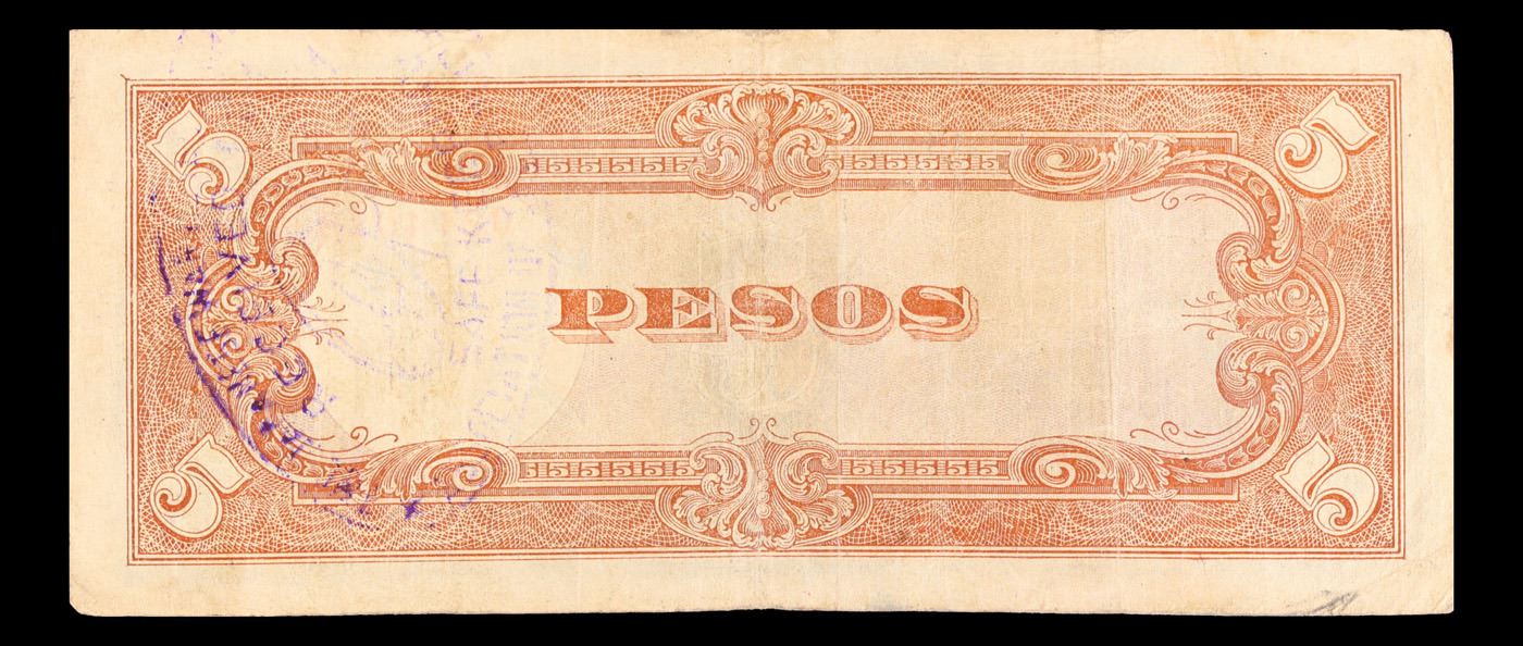 1943 Philippines (Japan WWII Occupation) 5 Pesos "JIM" Note P# 110 Grades vf+. Japanese invasion money, officially known as Southern Development Bank Notes (Japanese: ??????? Dai T?-A Sens? gunpy?, "Greater East Asia War military scrip"), was currency issued by the Japanese Military Authority as a replacement for local currency after the conquest of colonies and other states in World War II. Japan printed this currency for many countries, including Malaysia, Singapore, North Borneo, Sarawak, Burma, Brunei, and several Oceania territories controlled by Australia. Some Japanese invasion notes are actually counterfeits produced by the American Office of Strategic Services or the British Special Operations Executive, meant to flood and destabilize the economy in the occupied areas, sometimes also including propaganda printed on the notes themselves.