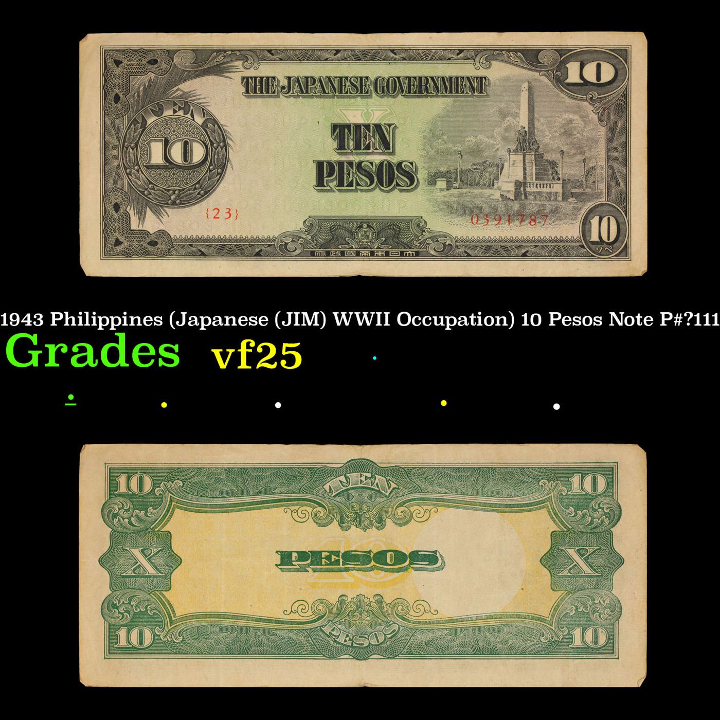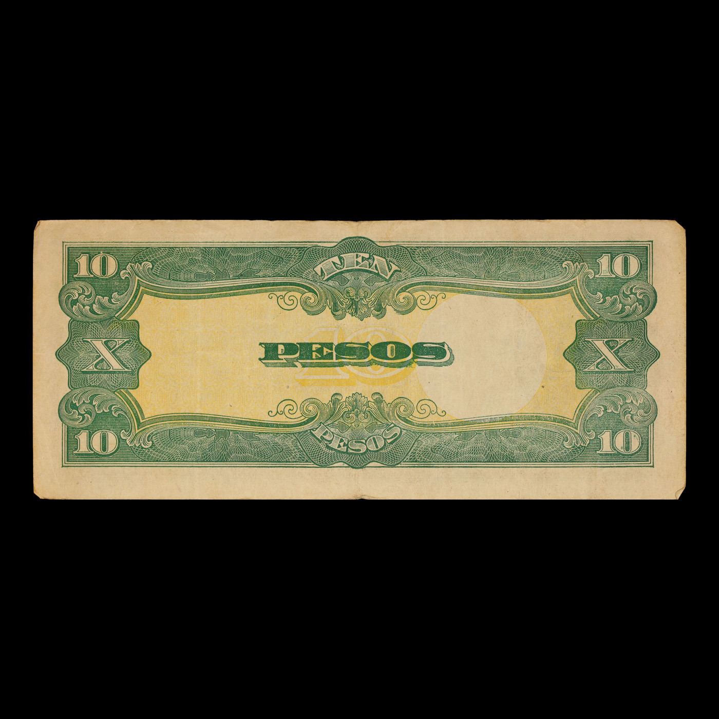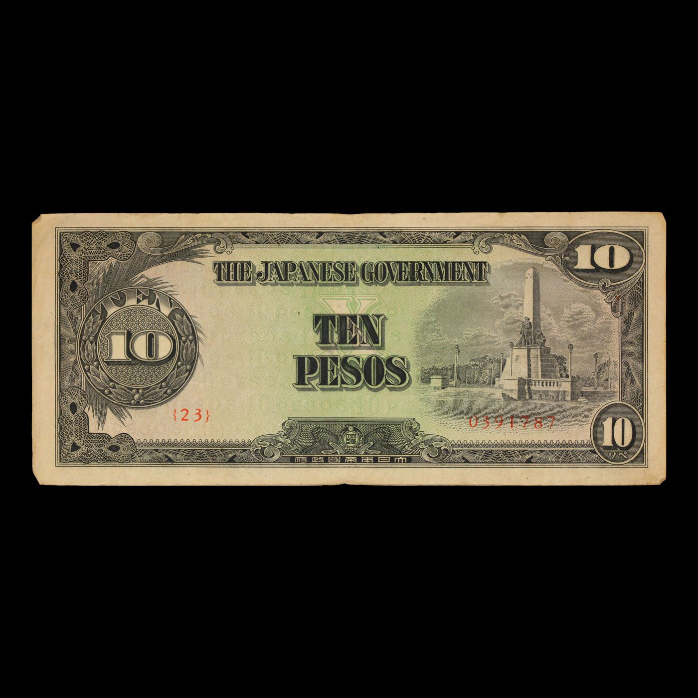 1943 Philippines (Japanese (JIM) WWII Occupation) 10 Pesos Note P#?111 Grades vf+. Japanese invasion money, officially known as Southern Development Bank Notes (Japanese: ??????? Dai T?-A Sens? gunpy?, "Greater East Asia War military scrip"), was currency issued by the Japanese Military Authority as a replacement for local currency after the conquest of colonies and other states in World War II. Japan printed this currency for many countries, including Malaysia, Singapore, North Borneo, Sarawak, Burma, Brunei, and several Oceania territories controlled by Australia. Some Japanese invasion notes are actually counterfeits produced by the American Office of Strategic Services or the British Special Operations Executive, meant to flood and destabilize the economy in the occupied areas, sometimes also including propaganda printed on the notes themselves.