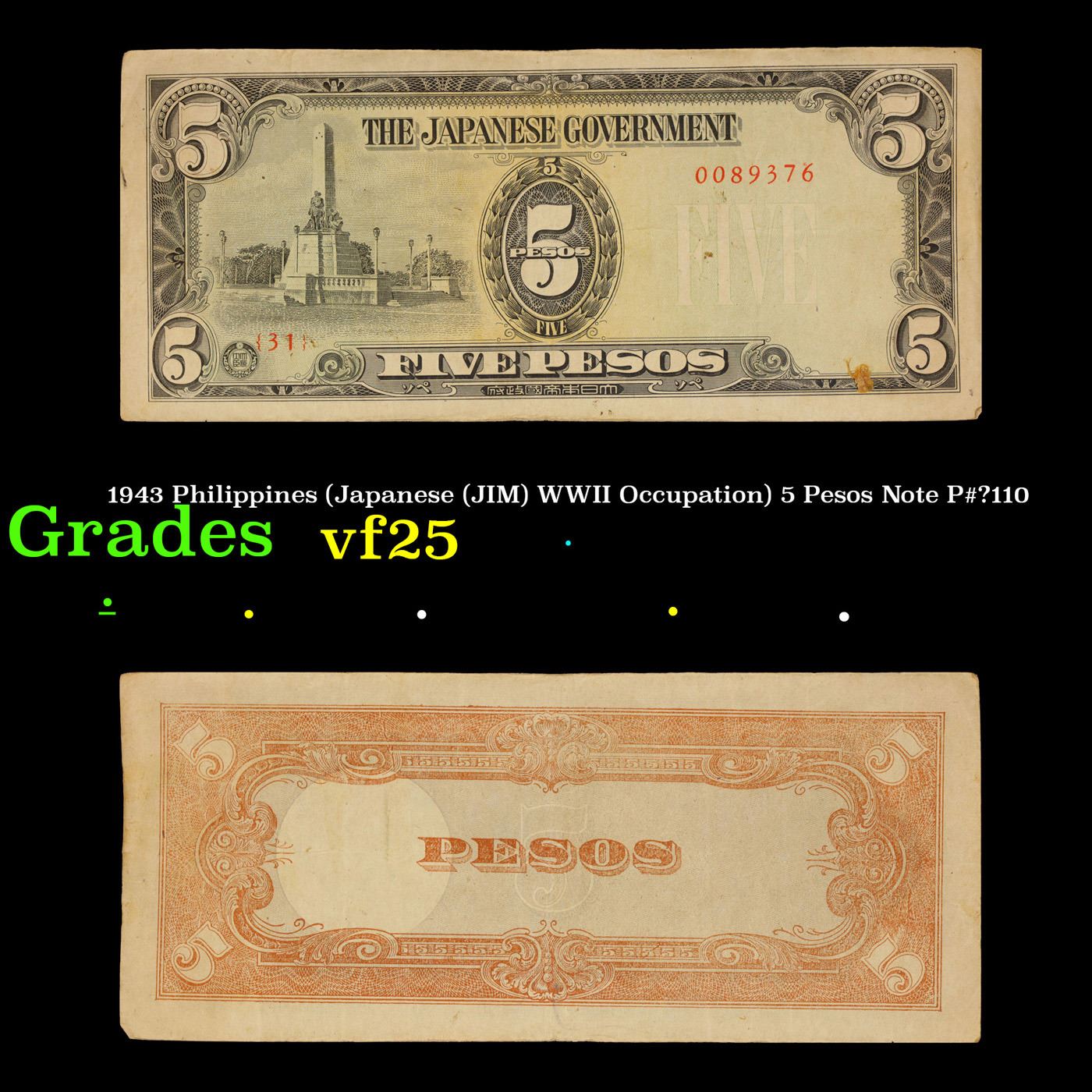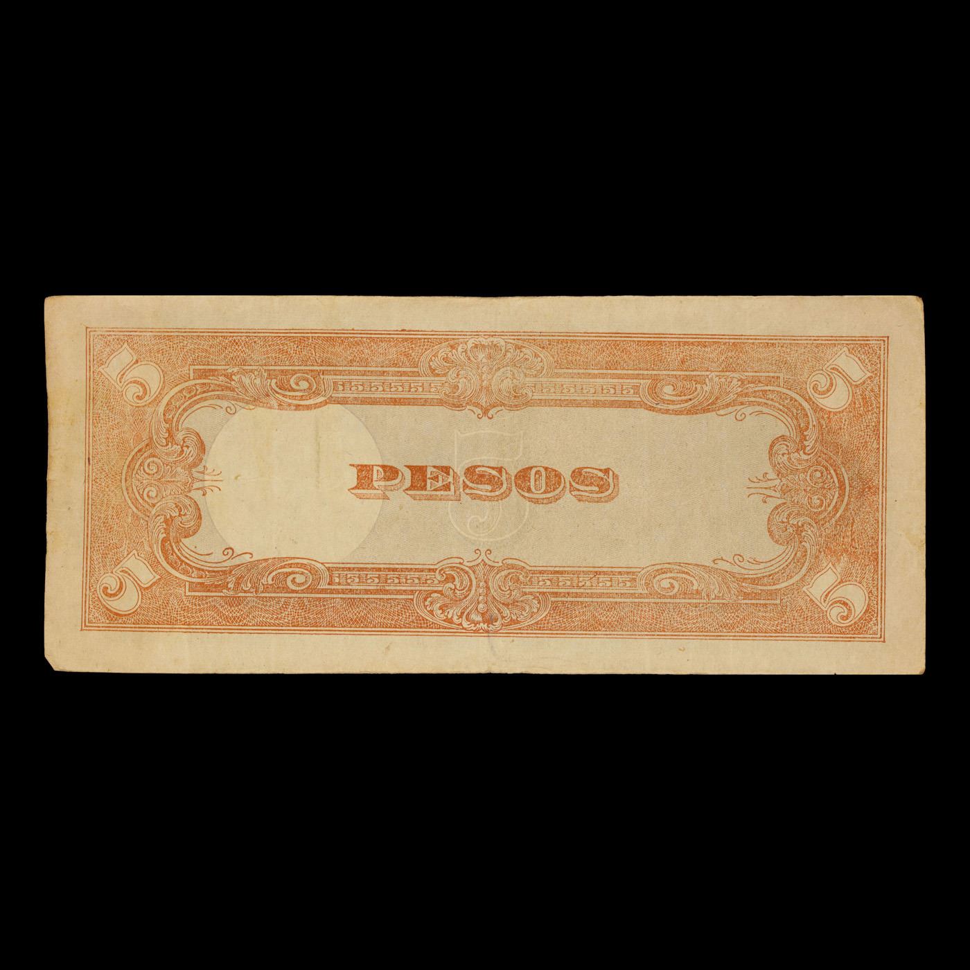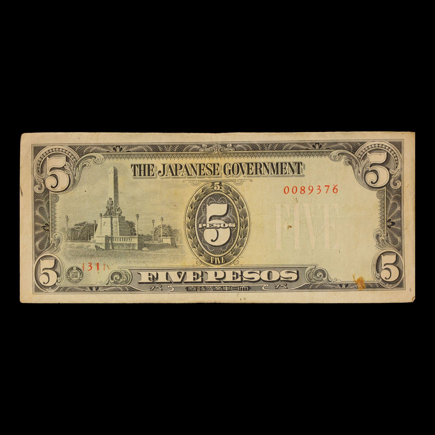 1943 Philippines (Japanese (JIM) WWII Occupation) 5 Pesos Note P#?110 Grades vf+. Japanese invasion money, officially known as Southern Development Bank Notes (Japanese: ??????? Dai T?-A Sens? gunpy?, "Greater East Asia War military scrip"), was currency issued by the Japanese Military Authority as a replacement for local currency after the conquest of colonies and other states in World War II. Japan printed this currency for many countries, including Malaysia, Singapore, North Borneo, Sarawak, Burma, Brunei, and several Oceania territories controlled by Australia. Some Japanese invasion notes are actually counterfeits produced by the American Office of Strategic Services or the British Special Operations Executive, meant to flood and destabilize the economy in the occupied areas, sometimes also including propaganda printed on the notes themselves.