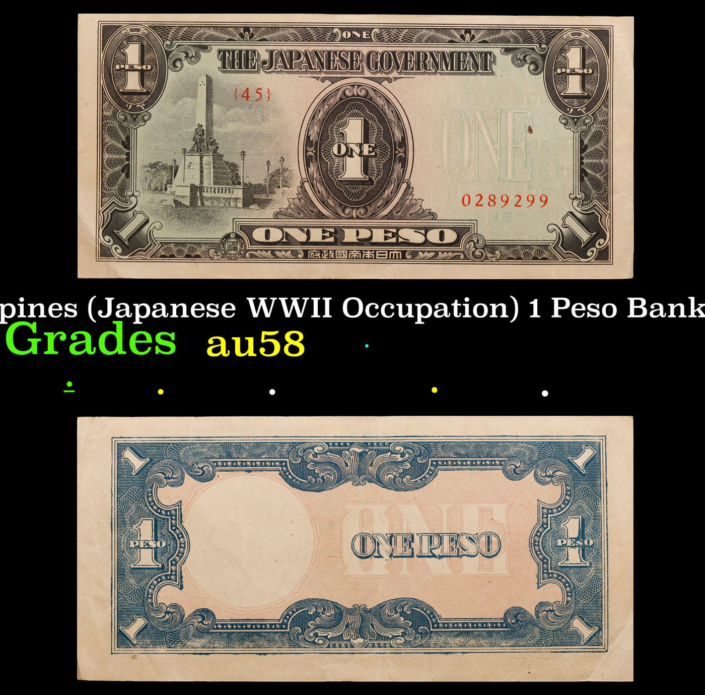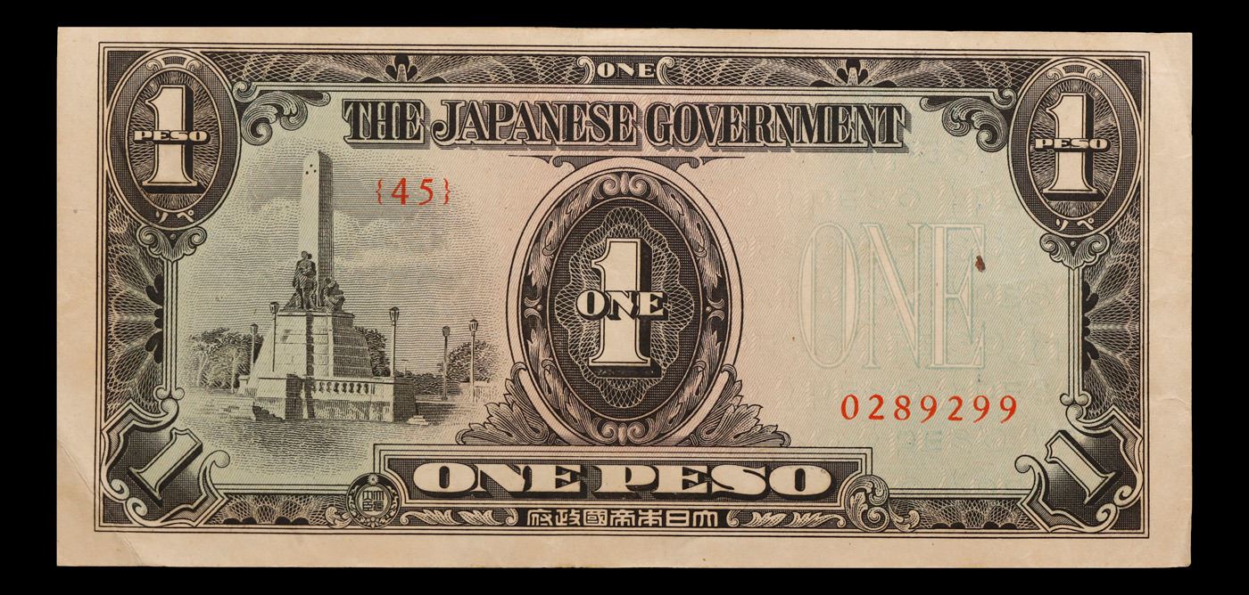 1943 Philippines (Japanese WWII Occupation) 1 Peso Banknote P#?109a Grades Choice AU/BU Slider. Japanese invasion money, officially known as Southern Development Bank Notes (Japanese: ??????? Dai T?-A Sens? gunpy?, "Greater East Asia War military scrip"), was currency issued by the Japanese Military Authority as a replacement for local currency after the conquest of colonies and other states in World War II. Japan printed this currency for many countries, including Malaysia, Singapore, North Borneo, Sarawak, Burma, Brunei, and several Oceania territories controlled by Australia. Some Japanese invasion notes are actually counterfeits produced by the American Office of Strategic Services or the British Special Operations Executive, meant to flood and destabilize the economy in the occupied areas, sometimes also including propaganda printed on the notes themselves.