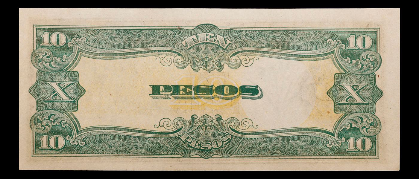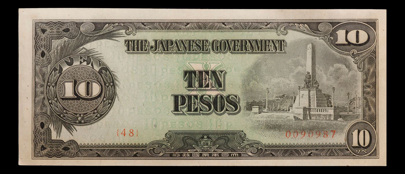 1943 Philippines (Japanese WWII Occupation) 10 Pesos Banknote P#?111 Grades Select CU. Japanese invasion money, officially known as Southern Development Bank Notes (Japanese: ??????? Dai T?-A Sens? gunpy?, "Greater East Asia War military scrip"), was currency issued by the Japanese Military Authority as a replacement for local currency after the conquest of colonies and other states in World War II. Japan printed this currency for many countries, including Malaysia, Singapore, North Borneo, Sarawak, Burma, Brunei, and several Oceania territories controlled by Australia. Some Japanese invasion notes are actually counterfeits produced by the American Office of Strategic Services or the British Special Operations Executive, meant to flood and destabilize the economy in the occupied areas, sometimes also including propaganda printed on the notes themselves.