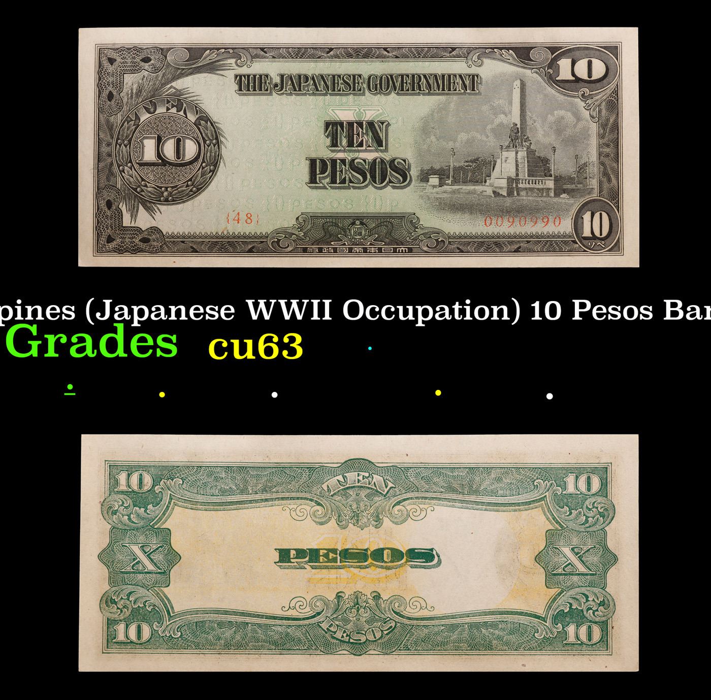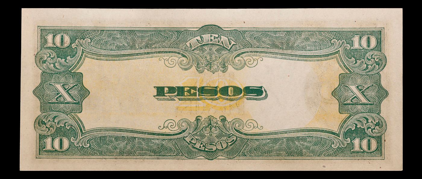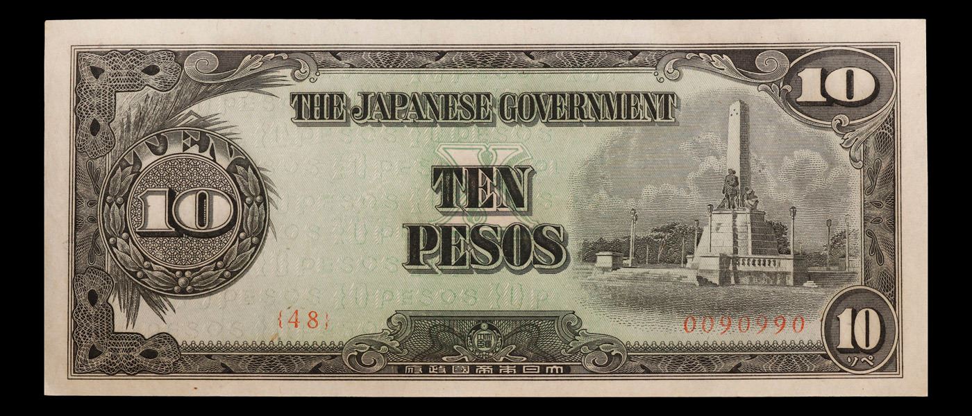 1943 Philippines (Japanese WWII Occupation) 10 Pesos Banknote P#?111 Grades Select CU. Japanese invasion money, officially known as Southern Development Bank Notes (Japanese: ??????? Dai T?-A Sens? gunpy?, "Greater East Asia War military scrip"), was currency issued by the Japanese Military Authority as a replacement for local currency after the conquest of colonies and other states in World War II. Japan printed this currency for many countries, including Malaysia, Singapore, North Borneo, Sarawak, Burma, Brunei, and several Oceania territories controlled by Australia. Some Japanese invasion notes are actually counterfeits produced by the American Office of Strategic Services or the British Special Operations Executive, meant to flood and destabilize the economy in the occupied areas, sometimes also including propaganda printed on the notes themselves.