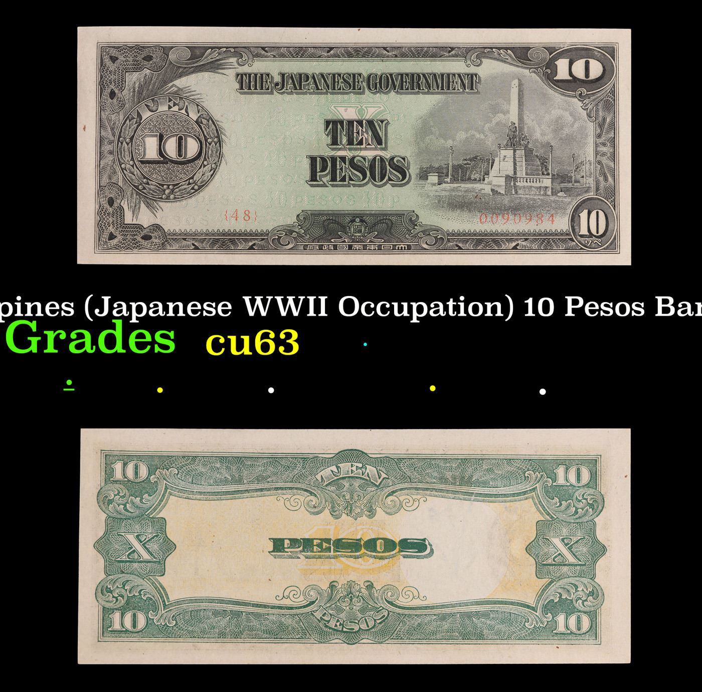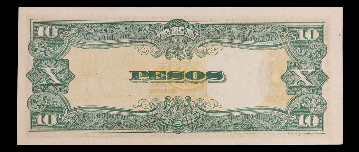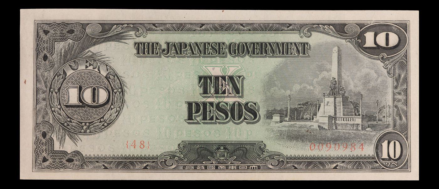 1943 Philippines (Japanese WWII Occupation) 10 Pesos Banknote P#?111 Grades Select CU. Japanese invasion money, officially known as Southern Development Bank Notes (Japanese: ??????? Dai T?-A Sens? gunpy?, "Greater East Asia War military scrip"), was currency issued by the Japanese Military Authority as a replacement for local currency after the conquest of colonies and other states in World War II. Japan printed this currency for many countries, including Malaysia, Singapore, North Borneo, Sarawak, Burma, Brunei, and several Oceania territories controlled by Australia. Some Japanese invasion notes are actually counterfeits produced by the American Office of Strategic Services or the British Special Operations Executive, meant to flood and destabilize the economy in the occupied areas, sometimes also including propaganda printed on the notes themselves.