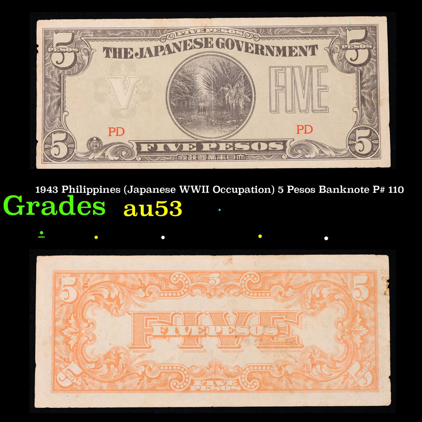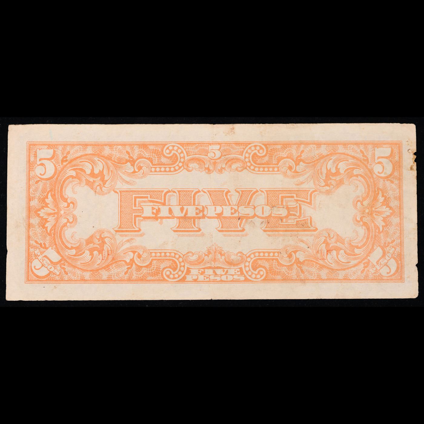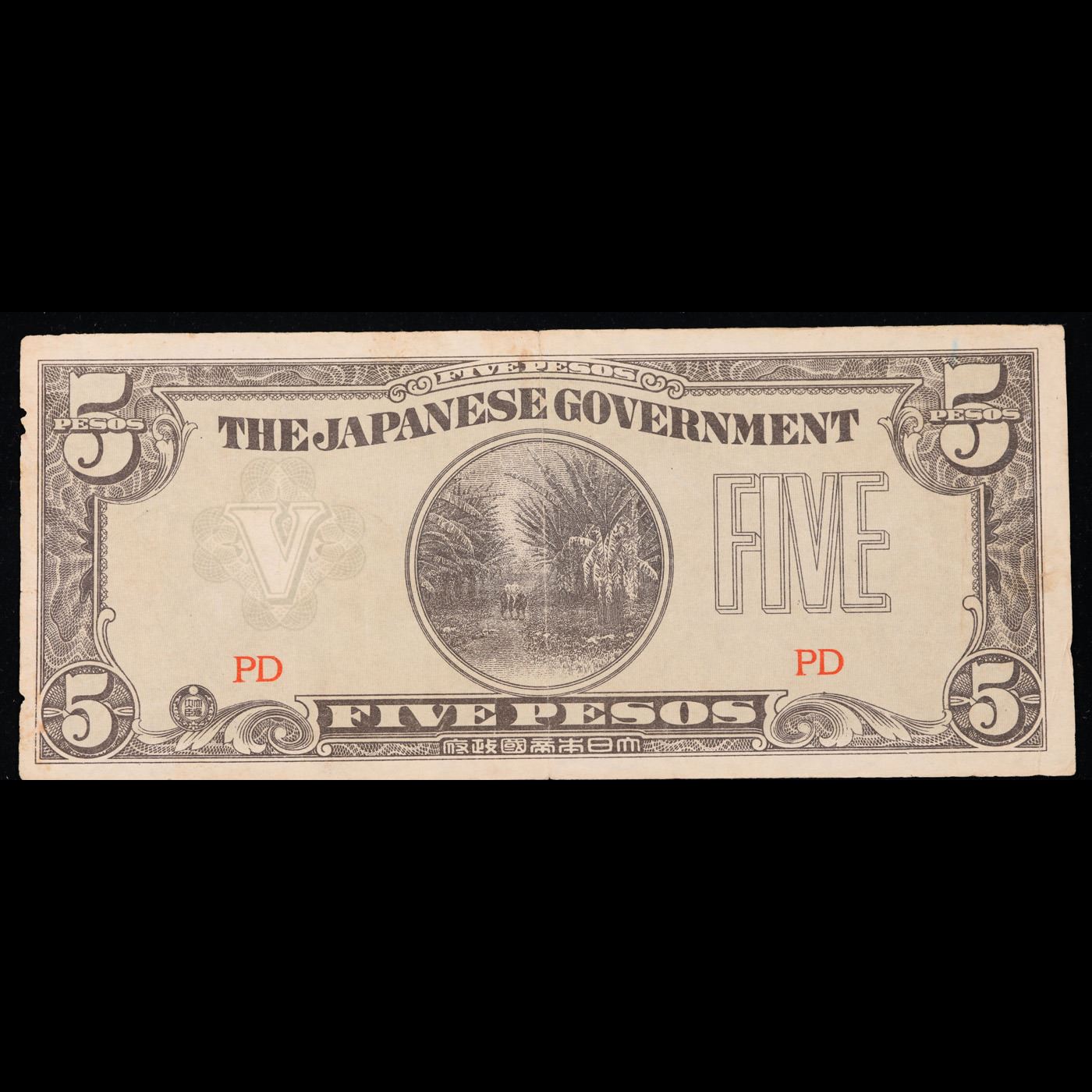 1943 Philippines (Japanese WWII Occupation) 5 Pesos Banknote P# 110 Grades Select AU. Japanese invasion money, officially known as Southern Development Bank Notes (Japanese: ??????? Dai T?-A Sens? gunpy?, "Greater East Asia War military scrip"), was currency issued by the Japanese Military Authority as a replacement for local currency after the conquest of colonies and other states in World War II. Japan printed this currency for many countries, including Malaysia, Singapore, North Borneo, Sarawak, Burma, Brunei, and several Oceania territories controlled by Australia. Some Japanese invasion notes are actually counterfeits produced by the American Office of Strategic Services or the British Special Operations Executive, meant to flood and destabilize the economy in the occupied areas, sometimes also including propaganda printed on the notes themselves.