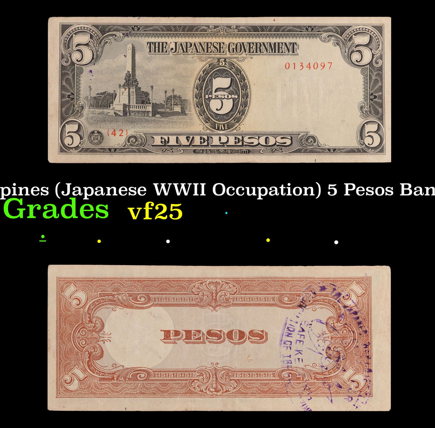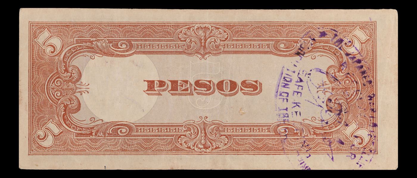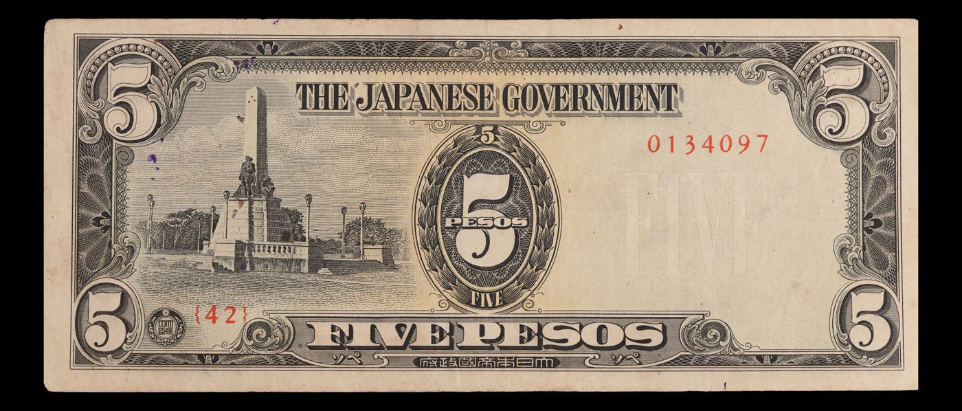 1943 Philippines (Japanese WWII Occupation) 5 Pesos Banknote P#?110 Grades vf+. Japanese invasion money, officially known as Southern Development Bank Notes (Japanese: ??????? Dai T?-A Sens? gunpy?, "Greater East Asia War military scrip"), was currency issued by the Japanese Military Authority as a replacement for local currency after the conquest of colonies and other states in World War II. Japan printed this currency for many countries, including Malaysia, Singapore, North Borneo, Sarawak, Burma, Brunei, and several Oceania territories controlled by Australia. Some Japanese invasion notes are actually counterfeits produced by the American Office of Strategic Services or the British Special Operations Executive, meant to flood and destabilize the economy in the occupied areas, sometimes also including propaganda printed on the notes themselves.
