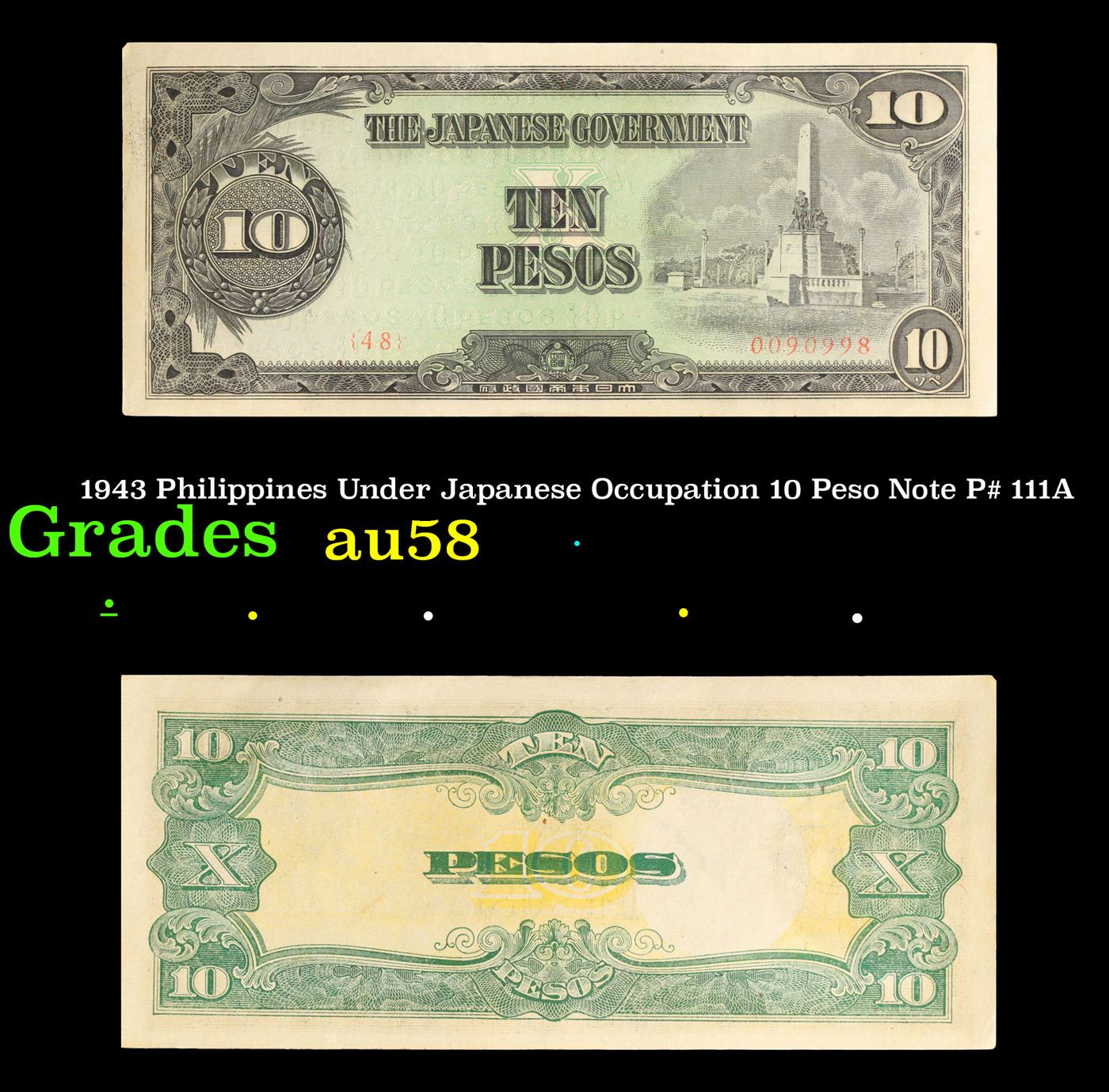 1943 Philippines Under Japanese Occupation 10 Peso Note P# 111A Grades Choice AU/BU Slider. Japanese invasion money, officially known as Southern Development Bank Notes (Japanese: ??????? Dai T?-A Sens? gunpy?, "Greater East Asia War military scrip"), was currency issued by the Japanese Military Authority as a replacement for local currency after the conquest of colonies and other states in World War II. Japan printed this currency for many countries, including Malaysia, Singapore, North Borneo, Sarawak, Burma, Brunei, and several Oceania territories controlled by Australia.