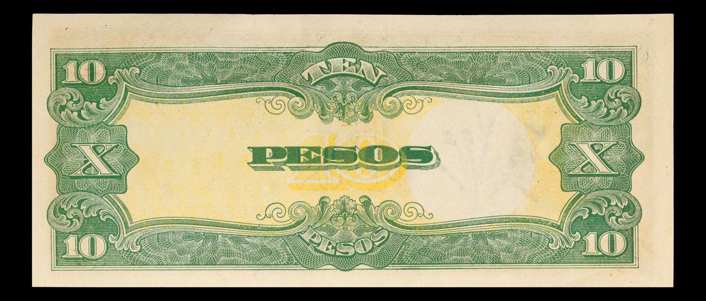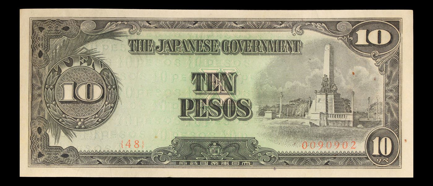 1943 Philippines Under Japanese Occupation 10 Peso Note P# 111A Grades Choice CU. Japanese invasion money, officially known as Southern Development Bank Notes (Japanese: ??????? Dai T?-A Sens? gunpy?, "Greater East Asia War military scrip"), was currency issued by the Japanese Military Authority as a replacement for local currency after the conquest of colonies and other states in World War II. Japan printed this currency for many countries, including Malaysia, Singapore, North Borneo, Sarawak, Burma, Brunei, and several Oceania territories controlled by Australia.
