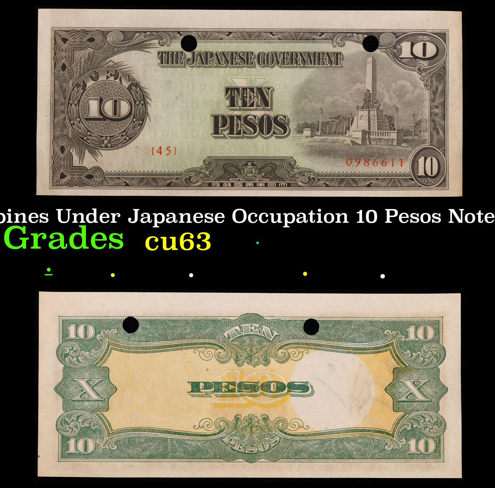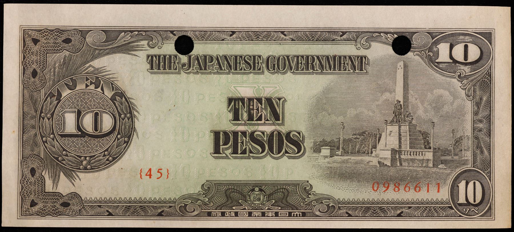 1943 Philippines Under Japanese Occupation 10 Pesos Note (JIM) P# 111A Grades Select CU. Japanese invasion money, officially known as Southern Development Bank Notes (Japanese: ??????? Dai T?-A Sens? gunpy?, "Greater East Asia War military scrip"), was currency issued by the Japanese Military Authority as a replacement for local currency after the conquest of colonies and other states in World War II. Japan printed this currency for many countries, including Malaysia, Singapore, North Borneo, Sarawak, Burma, Brunei, and several Oceania territories controlled by Australia.
