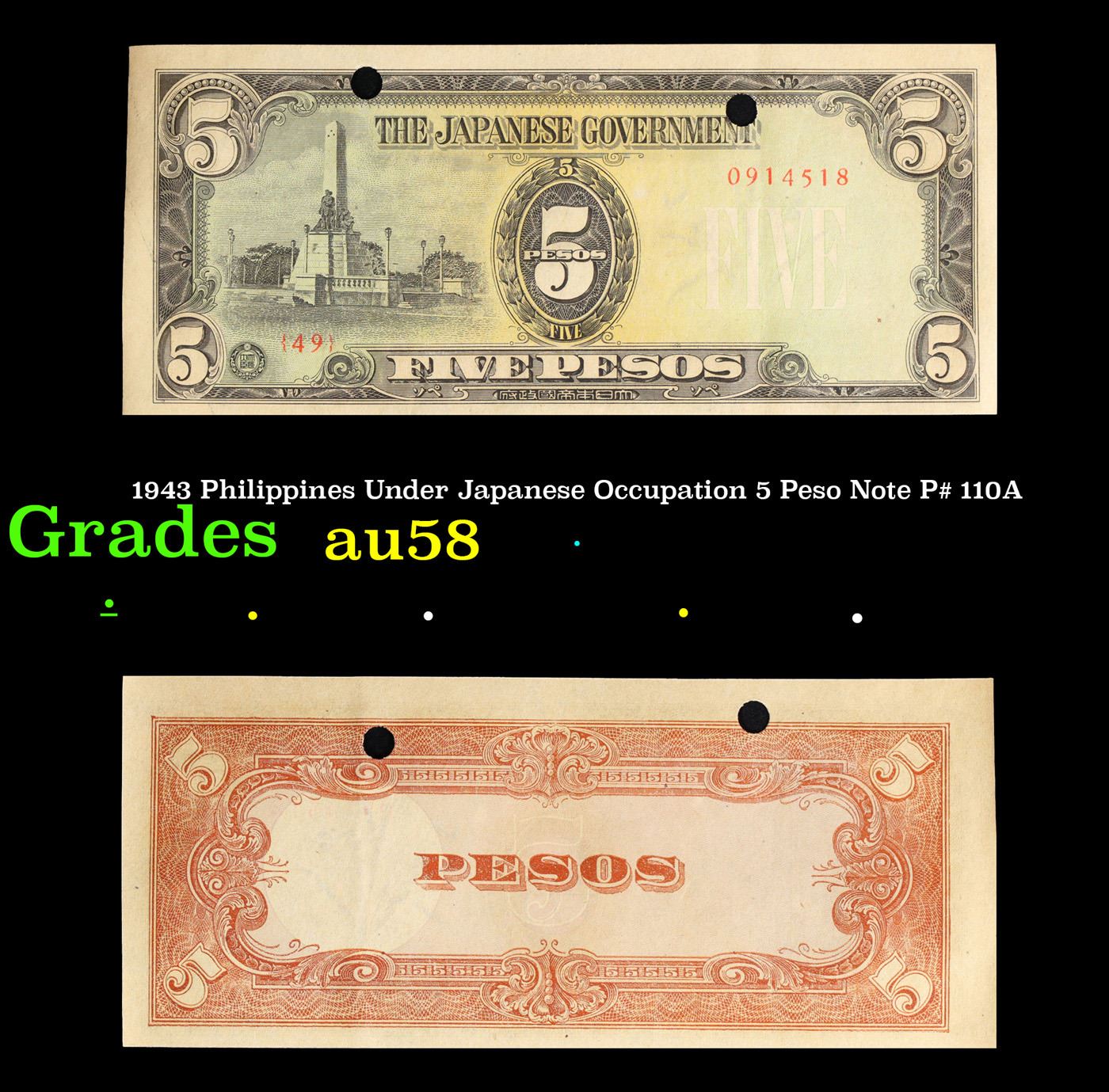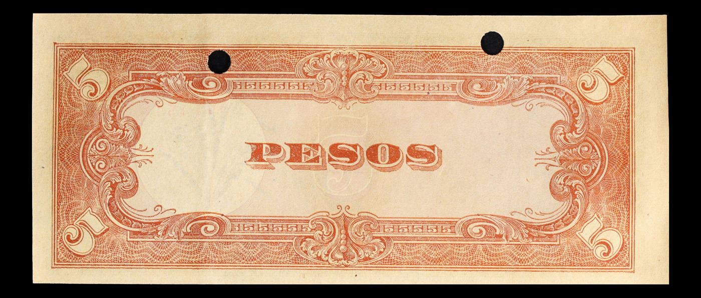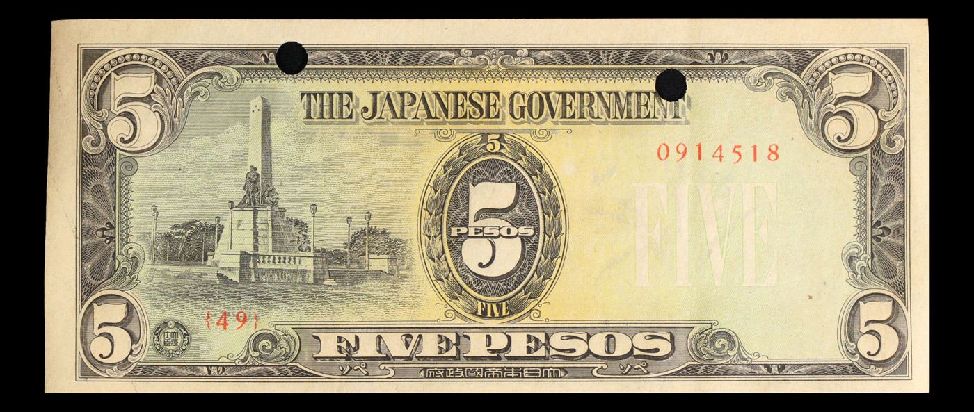 1943 Philippines Under Japanese Occupation 5 Peso Note P# 110A Grades Choice AU/BU Slider. Japanese invasion money, officially known as Southern Development Bank Notes (Japanese: ??????? Dai T?-A Sens? gunpy?, "Greater East Asia War military scrip"), was currency issued by the Japanese Military Authority as a replacement for local currency after the conquest of colonies and other states in World War II. Japan printed this currency for many countries, including Malaysia, Singapore, North Borneo, Sarawak, Burma, Brunei, and several Oceania territories controlled by Australia.