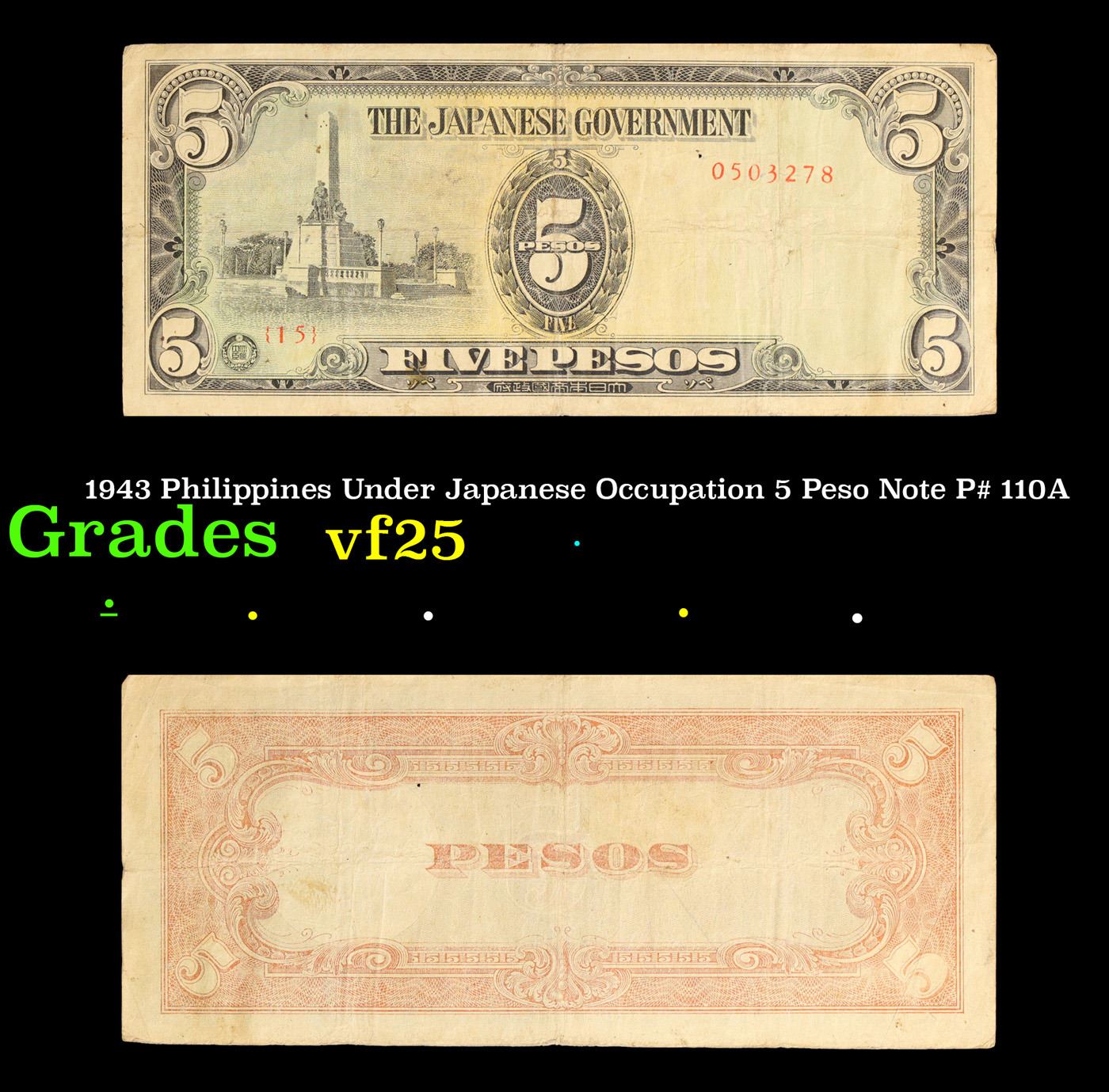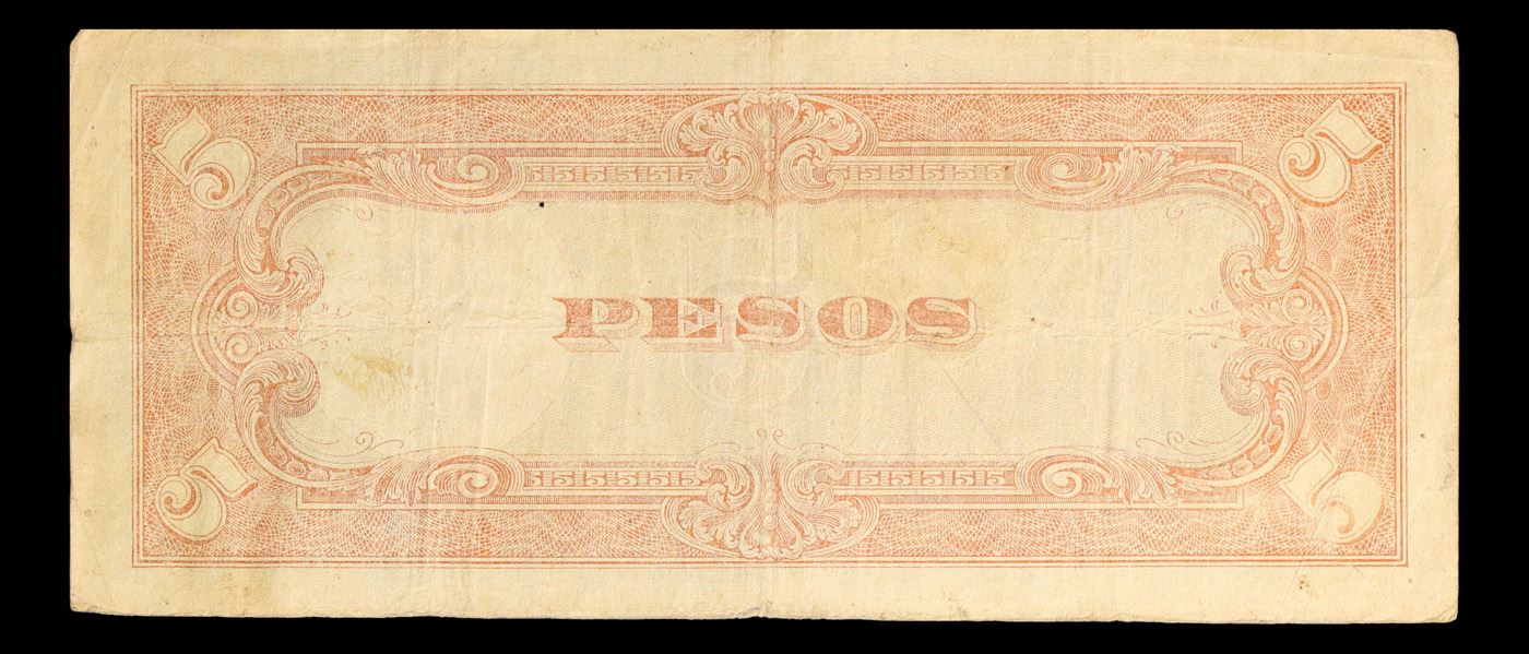 1943 Philippines Under Japanese Occupation 5 Peso Note P# 110A Grades vf+. Japanese invasion money, officially known as Southern Development Bank Notes (Japanese: ??????? Dai T?-A Sens? gunpy?, "Greater East Asia War military scrip"), was currency issued by the Japanese Military Authority as a replacement for local currency after the conquest of colonies and other states in World War II. Japan printed this currency for many countries, including Malaysia, Singapore, North Borneo, Sarawak, Burma, Brunei, and several Oceania territories controlled by Australia.
