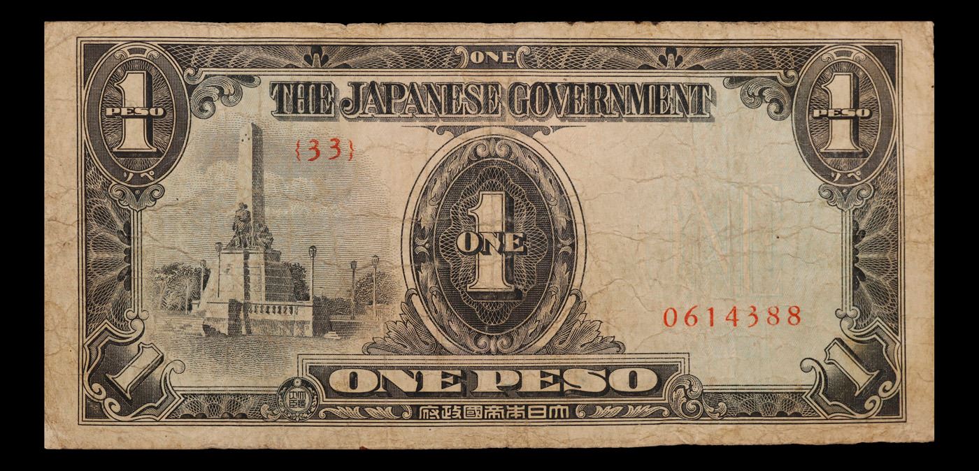 1943 Philippines Under Japanese occupation 1 Peso Note P# 109A Grades vf+. Japanese invasion money, officially known as Southern Development Bank Notes (Japanese: ??????? Dai T?-A Sens? gunpy?, "Greater East Asia War military scrip"), was currency issued by the Japanese Military Authority as a replacement for local currency after the conquest of colonies and other states in World War II. Japan printed this currency for many countries, including Malaysia, Singapore, North Borneo, Sarawak, Burma, Brunei, and several Oceania territories controlled by Australia.