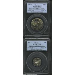1943-S 10C Dime--Uncentered Broadstrike--AU55 PCGS, light, mottled, golden-gray and pale russet patina drifts toward the rims, there is an extra lip of flan along the lower right obverse and in the corresponding area on the reverse; and a 1999-P Anthony Dollar--Uncentered Broadstrike--MS62 PCGS, the rims are distended all the way around both sides, but this feature is most readily evident from 11-3 o'clock on the obverse, golden tinged with swirling mint luster. 2 coins Important notice: We expect to be auctioning lots at the rate of 200-250 per hour. Sometimes eBay Premier live bid software cannot keep up with that pace, so we strongly recommend that you place a realistic proxy bid now as insurance to avoid disappointment. Also please note that all Heritage/CAA lots purchased through eBay Premier carry a 20% Buyer's Premium. Please make sure you read the Terms and Conditions.