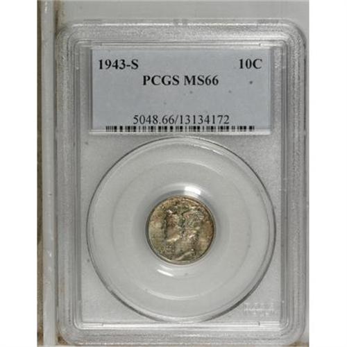 <B>1943-S 10C MS66 PCGS.</B></I> PCGS Population (853/147). NGC Census: (877/586). Mintage: 60,400,000. Numismedia Wsl. Price for NGC/PCGS coin in MS66: $40. (#5048)<BR><BR><b>Shipping:</b> Coins & Currency (<a target="_blank" href="http://www.heritageauctions.com/common/shipping.php">view shipping information</a>)