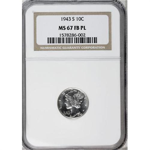 <B>1943-S 10C MS67 Full Bands Prooflike NGC.</B></I> This is the solitary 1943-S dime given both Full Bands and Prooflike designations by NGC! Carefully preserved surfaces yield full brilliance, and a powerful strike leaves complete definition on the design elements.<BR><BR><B>Coin Engraver:</B> Adolph A. Weinman<BR><BR><b>Shipping:</b> Coins & Currency (<a target="_blank" href="http://www.heritageauctions.com/common/shipping.php">view shipping information</a>)