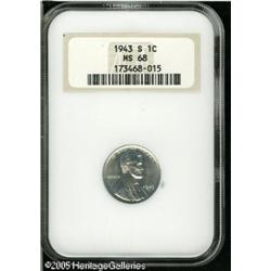 <B>1943-S 1C MS68 NGC.</B></I> Sharply struck with bright, semi-prooflike fields. A spectacular example of this popular one-year type. Population: 13 in 68, 0 finer (1/05).<BR><I>From The Kim Mitchell Collection, Part Two.</B></I> Lot:5548