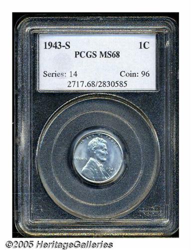 <B>1943-S<1C> MS68 PCGS.</B></I> Brilliant luster with smooth even surfaces, a sharp strike and a little undulating blue color. Exceptionally well preserved, no examples have been certified finer by either NGC or PCGS (6/04).<BR><I>From The William Bickel Collection, Part One.</B></I>