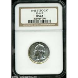 <table><tr><td><TABLE cellSpacing=0 cellPadding=0 width="100%" bgColor=#000000 border=0><TBODY> <TR><TD width="100%"><TABLE cellSpacing=1 cellPadding=3 width="100%" border=0><TBODY><TR><TD width="100%" bgColor=#79735c><FONT face=arial color=#ffffff size=3><B>Description</B> </FONT></TD></TR><TR><TD width="100%" bgColor=#ffffff><FONT face=arial size=2><B>1943-S 25C Doubled Die MS67 NGC.</B></I> FS-17. DDO 1-O-I. Although several doubled die obverse varieties are listed in <I>Cherrypickers'</B></I> for wartime Washington Quarters, none of them are more impressive than FS-17, which has a wide spread on IN GOD WE TRUST. The date and LIBERTY are also nicely die doubled. <I>Cherrypickers'</B></I> states that the variety is "very rare in Mint State," which is supported by the NGC certified population of only 31 Uncirculated pieces. Hints of golden-brown and rose patina visit the margins of this satiny and essentially pristine Superb Gem. The centers are well struck, although the peripheral legends have occasional softness of definition, as made. Population: 2 in 67, 0 finer (9/03). </FONT></TD></TR></TBODY></TABLE></TD></TR></TBODY></TABLE><BR><A name=PricesRealized></A><TABLE cellSpacing=0 cellPadding=0 width="100%" bgColor=#000000 border=0><TBODY><TR><TD width="100%"><TABLE cellSpacing=1 cellPadding=3 width="100%" border=0><TBODY><TR><TD width="100%" bgColor=#79735c><A name=PR><FONT face=arial color=#ffffff size=3><B>Previous Prices from Heritage Auctions</B> </FONT></A></TD></TR><TR><TD bgColor=#f6f6ed>No Prior Data Recorded </TD></TR><TR><TD bgColor=#ffffff><FONT face=arial size=1 ?>PLEASE NOTE: All prices realized reflect the final hammer price PLUS the buyer's premium in auctions that charge a buyer's premium. Each item has a notation at the top of the listing indicating whether that lot included a buyer's premium. Example: A item that sells with a final hammer price of $100 and a 20% buyer's premium will display with a price realized of $120. All information listed is intended to be as accurate as possible, but errors are possible. Please use this guide carefully and inform us of any inaccuracies. </FONT></TD></TR></TBODY></TABLE></TD></TR></TBODY></TABLE><BR><TABLE cellSpacing=0 cellPadding=0 width="100%" bgColor=#000000 border=0><TBODY><TR><TD width="100%"><TABLE cellSpacing=1 cellPadding=3 width="100%" border=0><TBODY><TR><TD width="100%" bgColor=#79735c colSpan=6><FONT face=arial color=#ffffff size=3><B>Price Guide*</B> </FONT></TD></TR><TR bgColor=#f6f6ed><TD align=middle><B>Grade</B> </TD><TD align=middle><B>Coin World<BR>(Trends)</B> </TD><TD align=middle><B>Numismedia<BR>Retail</B> </TD><TD align=middle><B>Numismedia<BR>Wholesale</B> </TD><TD align=middle><B>Coin<BR>Universe</B> </TD><TD align=middle><B>Heritage<BR>Value Index</B> </TD></TR><TR bgColor=#ffffff><TD align=middle>66</TD><TD align=right>---</TD><TD align=right>---</TD><TD align=right>---</TD><TD align=right>---</TD><TD align=right>---</TD></TR><TR style="FONT-WEIGHT: bold" bgColor=#cccfdd><TD align=middle>67</TD><TD align=right>---</TD><TD align=right>---</TD><TD align=right>---</TD><TD align=right>---</TD><TD align=right>---</TD></TR><TR bgColor=#ffffff><TD align=middle>68</TD><TD align=right>---</TD><TD align=right>---</TD><TD align=right>---</TD><TD align=right>---</TD><TD align=right>---</TD></TR><TR bgColor=#ffffff><TD colSpan=6><FONT size=1>*All information listed is intended to be as accurate as possible, but errors are possible. No item may be returned or refused based on this information which is provided as a service to our customers. You should contact each pricing source directly to determine the accuracy of this information. </FONT></TD></TR></TBODY></TABLE></TD></TR></TBODY></TABLE><BR><TABLE cellSpacing=0 cellPadding=0 width="100%" bgColor=#000000 border=0><TBODY><TR><TD width="100%"><TABLE cellSpacing=1 cellPadding=3 width="100%" border=0><TBODY><TR><TD width="100%" bgColor=#79735c><FONT face=arial color=#ffffff size=3><B>Population Guide</B> </FONT></TD></TR><TR bgColor=#ffffff><TD align=middle><!-- Begin Output of Population Grid--><TABLE cellSpacing=0 cellPadding=0 width="100%" border=0><TBODY><TR><TD vAlign=center><TABLE cellSpacing=0 width="100%" border=1 cellsadding="3"><TBODY><TR><TD vAlign=center><TABLE cellSpacing=0 cellPadding=3 width="100%" border=1><TBODY><TR><TD vAlign=center align=middle bgColor=#f0f1e8 colSpan=2 <CENTER><FONT face=Arial size=2><B>PCGS Pop </B></FONT><CENTER></CENTER></TD><TD vAlign=center align=middle bgColor=#f0f1e8 colSpan=2><CENTER><FONT face=Arial size=2><B>NGC Pop</B></CENTER></FONT></TD></TR><TR><TD vAlign=center><FONT face=Arial size=2>(67)</FONT> </TD><TD vAlign=center align=right><FONT face=Arial size=2>0</FONT> </TD><TD vAlign=center><FONT face=Arial size=2>(67)</FONT> </TD><TD vAlign=center align=right><FONT face=Arial size=2>1</FONT> </TD></TR><TR><TD vAlign=center><FONT face=Arial size=2>(>67)</FONT> </TD><TD vAlign=center align=right><FONT face=Arial size=2>0</FONT> </TD><TD vAlign=center><FONT face=Arial size=2>(>67)</FONT> </TD><TD vAlign=center align=right><FONT face=Arial size=2>0</FONT> </TD></TR></TBODY></TABLE></TD></TR></TBODY></TABLE></TD></TR></TBODY></TABLE><!-- End Output of Population Grid--></TD></TR></TBODY></TABLE></TD></TR></TBODY></TABLE><BR><TABLE cellSpacing=0 cellPadding=0 width="100%" bgColor=#000000 border=0><TBODY><TR> Important notice: Heritage usually auctions material at the rate of 200-250 lots per hour. On some occasions eBay Live bid software or the Internet may not be able to keep up with the pace of the auction. We recommend placing a realistic absentee bid now as insurance to avoid disappointment. Occasionally the auctioneer may eliminate or reject an eBay Live bid, and the auctioneer may also reopen a lot after the close of the eBay live bidding (usually because we missed an audience bid), and may reject your bid even if it shows you as the winning bidder. By bidding via eBay Live, you agree that Heritage may award the lot