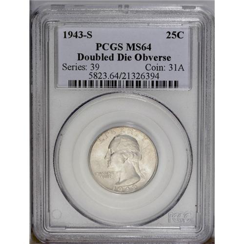 <B>1943-S<25C> Doubled Die Obverse MS64 PCGS.</B></I> FS-017. This <I>Guide Book</B></I> doubled die variety shows strong separation on the left side obverse legends. A tiny mark near the mouth, but the satiny pearl-gray surfaces are otherwise well preserved. Population: 43 in 64, 16 finer (3/06).